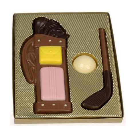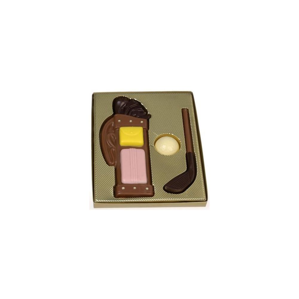 Čokoládová sportovní sada na golf je ručně vyrobena z pravé, belgické čokolády prvotřídní chuti. Kombinace mléčné, bílé a hořké čokolády. Hezký sladký dárek a originální bonboniéra pro golfisty a milovníky tohoto sportu. Ať už k svátku či jen tak pro radost.