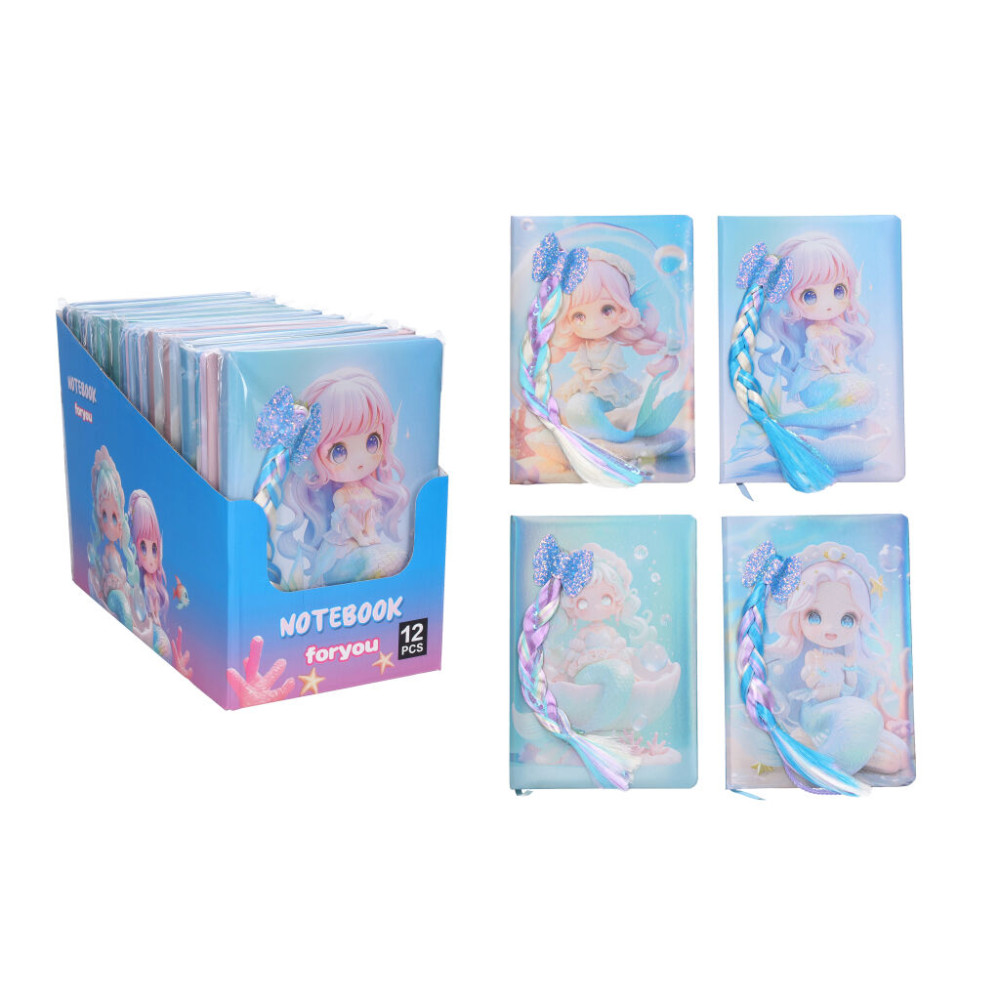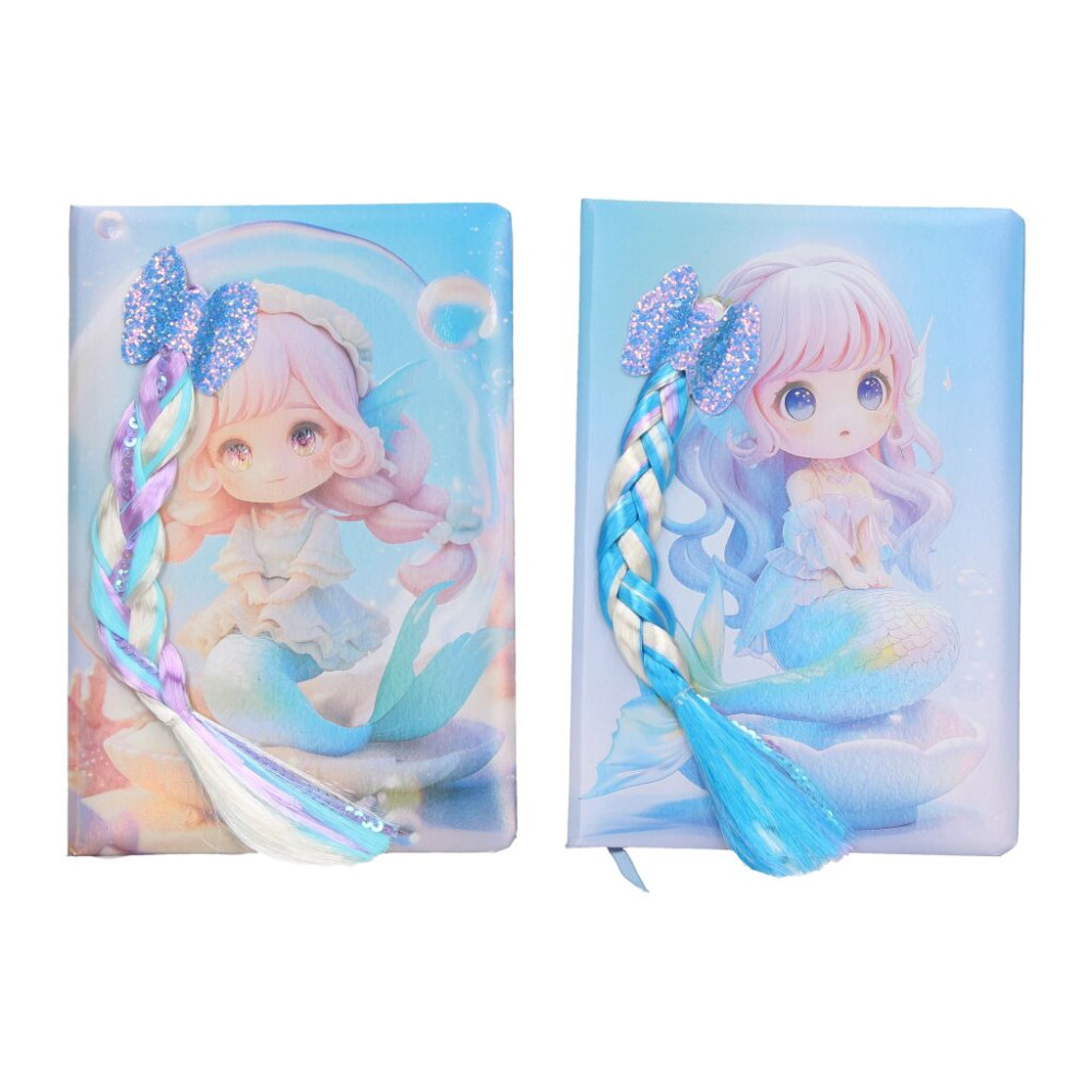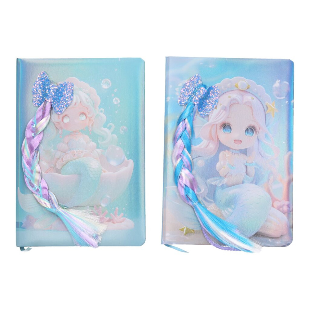 Krásný modrý notes s motivem mořské pany s culíkem, který z deníku trčí.