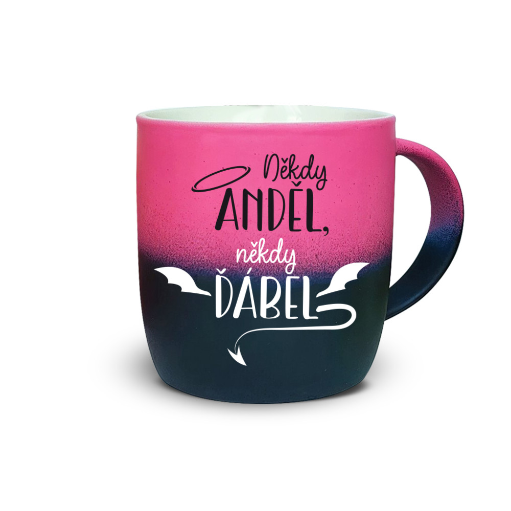 Neonový hrnek s potiskem „Někdy ANDĚL, někdy ĎÁBEL.“. Díky unikátní technologii povrchu soft touch a zářivým barvám se z obyčejného pití kávy či čaje stává stylový rituál.