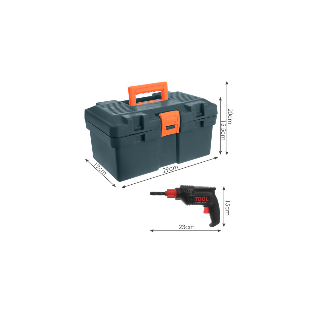 Rozměr: kufřík 19 x 29 x 15,5 cm, rukojeť 4,5 cm, vrtačka 23 x 15 cm
