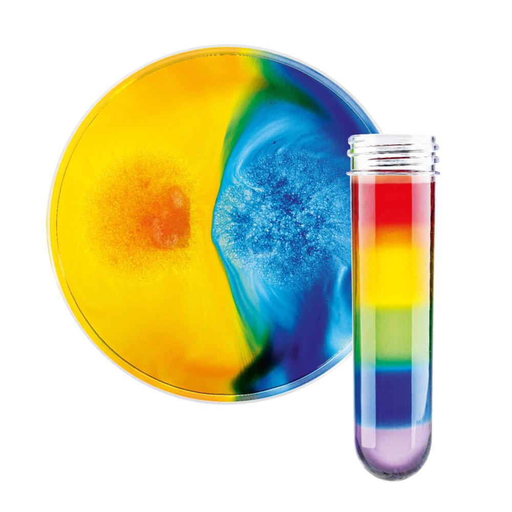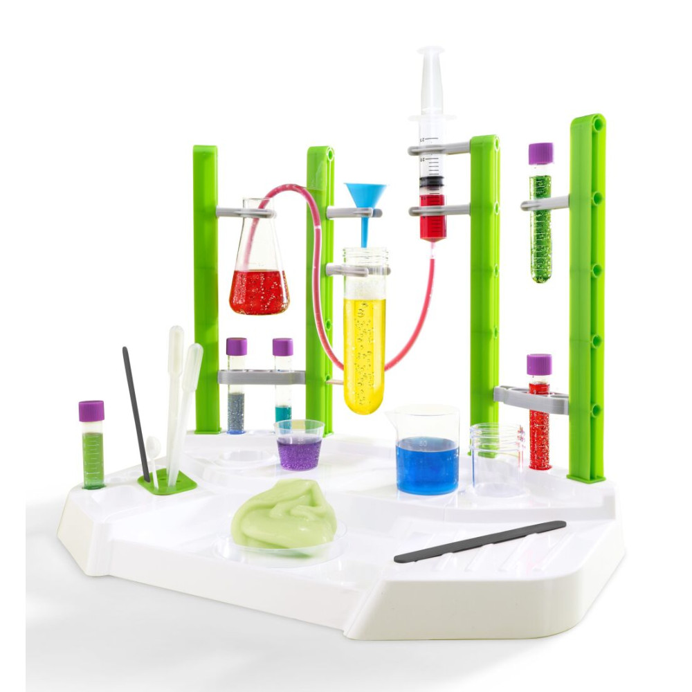 Obsahuje podstavec, pipety, zkumavky, lahvičky, trychtýř, hadičku, stříkačku, různé držáky a další příslušenství pro sestavení laboratoře.