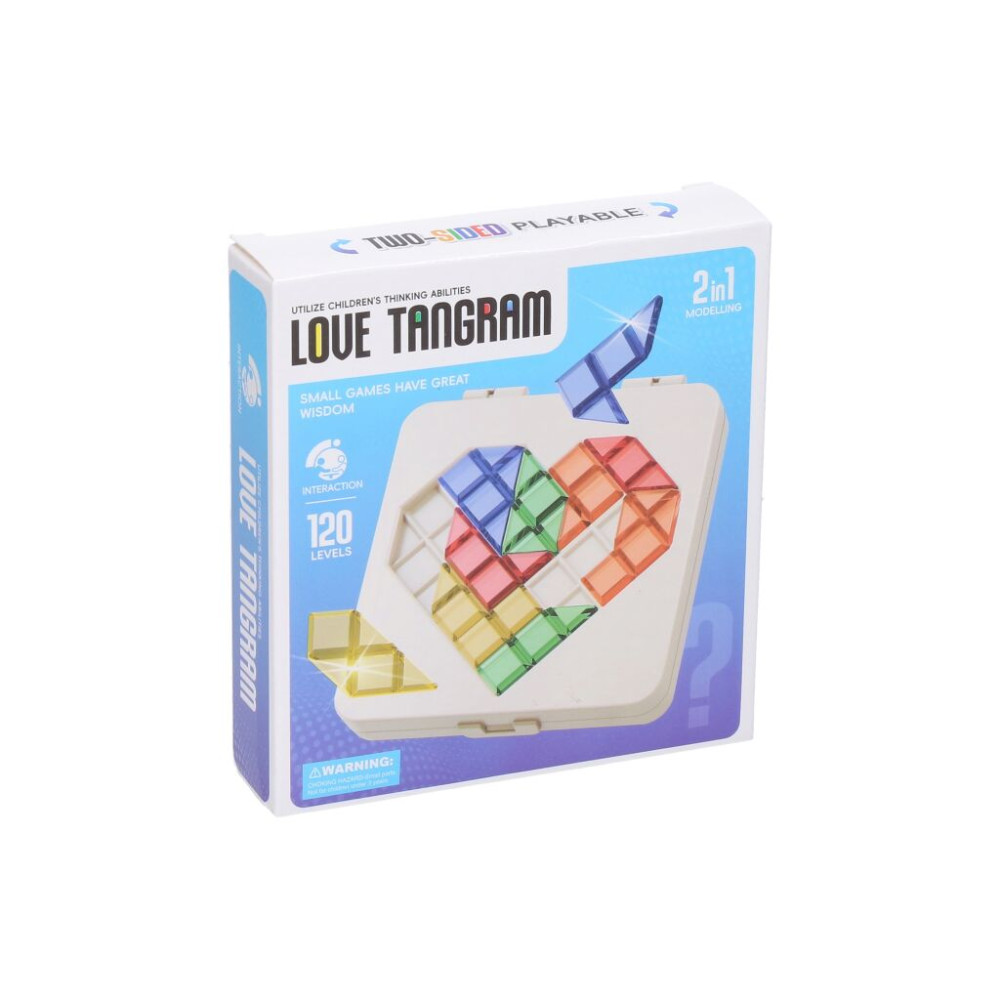 Tangram hlavolam srdce. Obsahuje dvě hrací pole ve tvaru srdce a obdélníku. Obsahuje zadání 120 úrovní se zvyšující se náročností a jejich řešení.