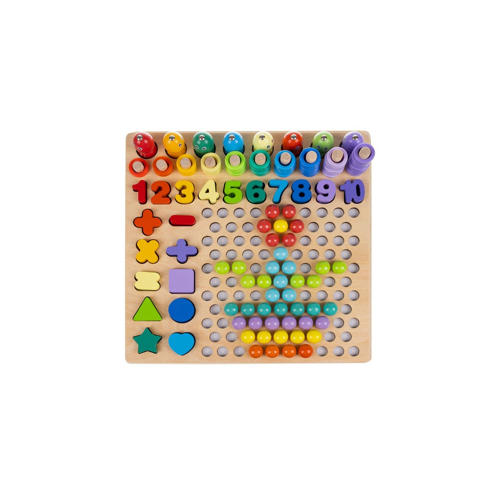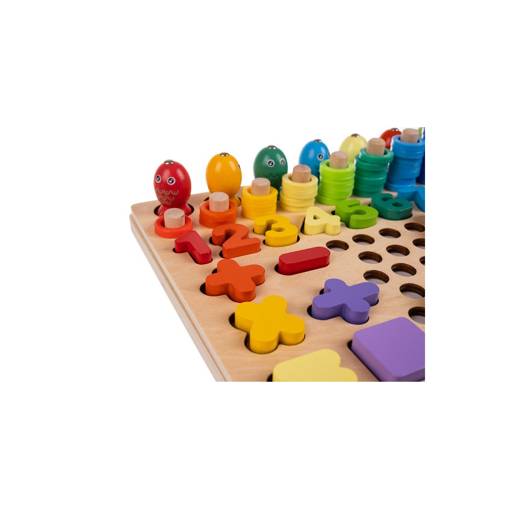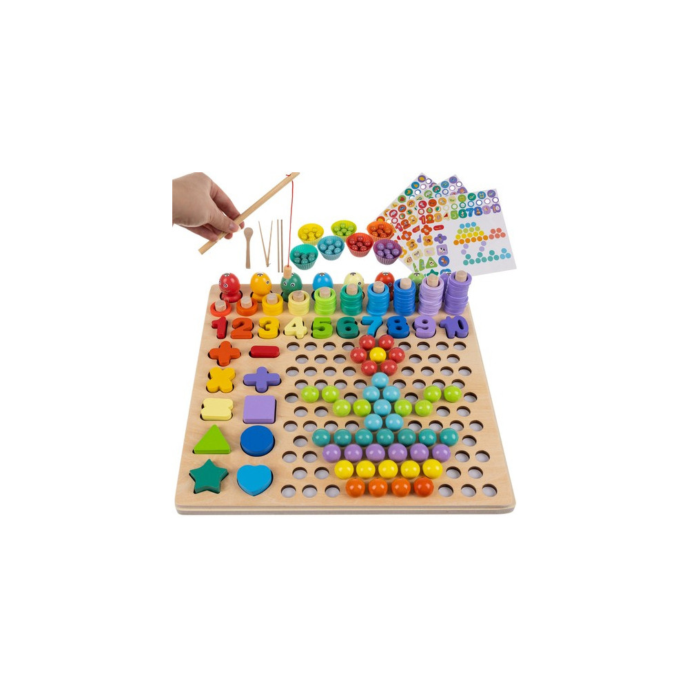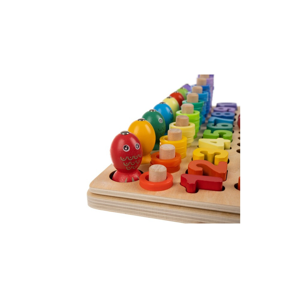 Dřevěná vzdělávací hračka s mozaikou, počítáním, tříděním barev, chytáním rybiček apod. Pomáhá dětem rozvíjet manuální zručnost a představivost a také rozvíjet logické myšlení a koordinaci. Barevnost hračky upoutá pozornost a variabilita her zajistí, že si každý vybere to své.