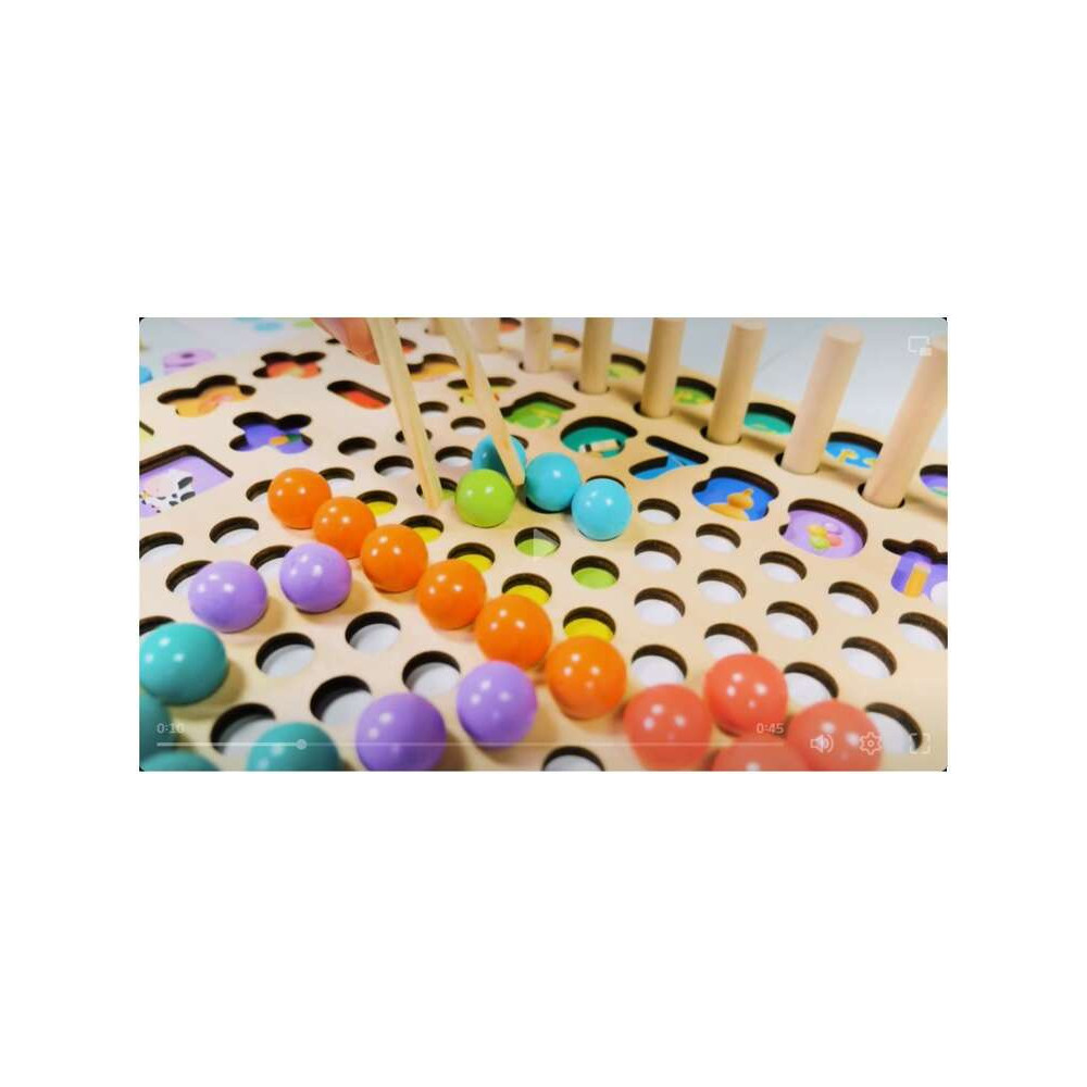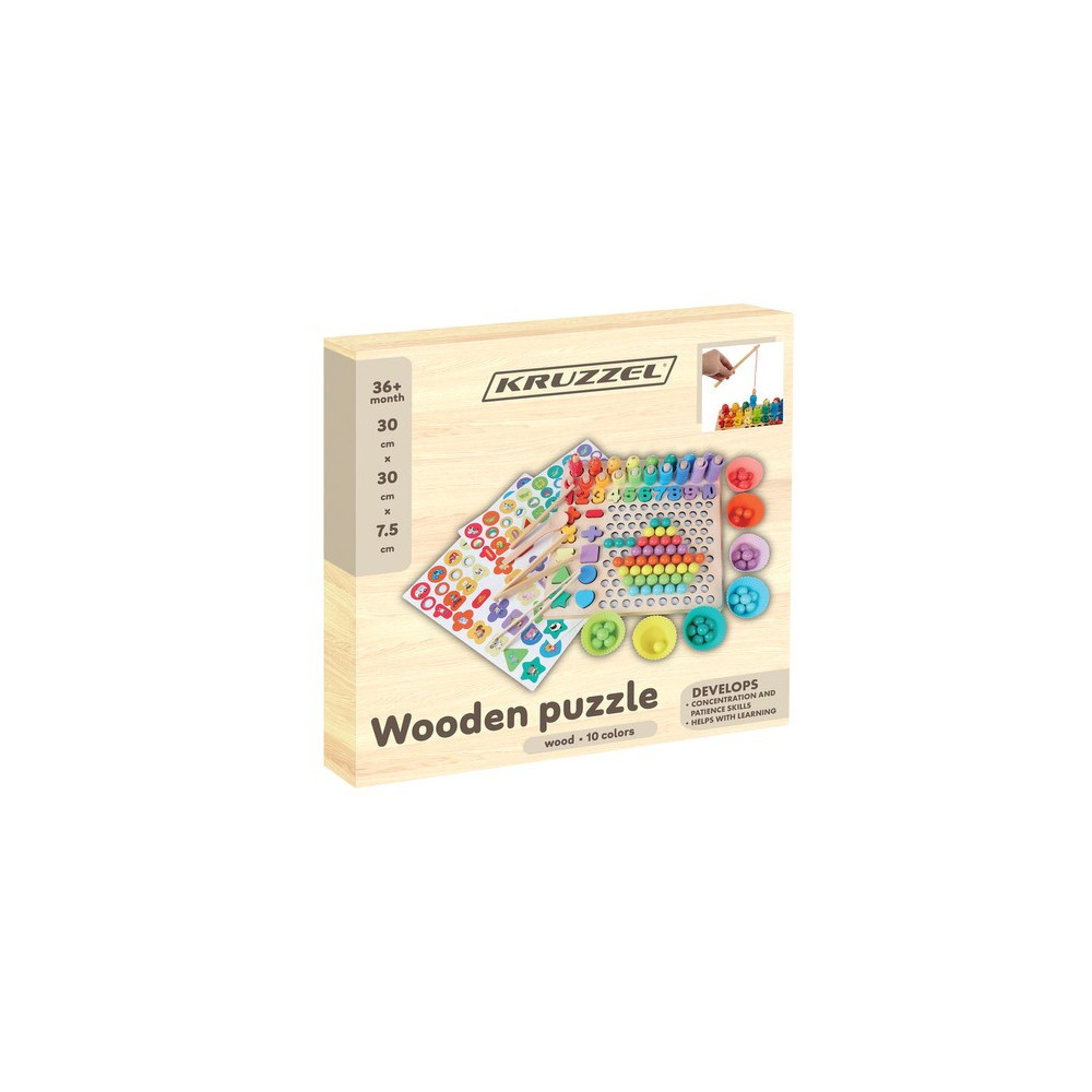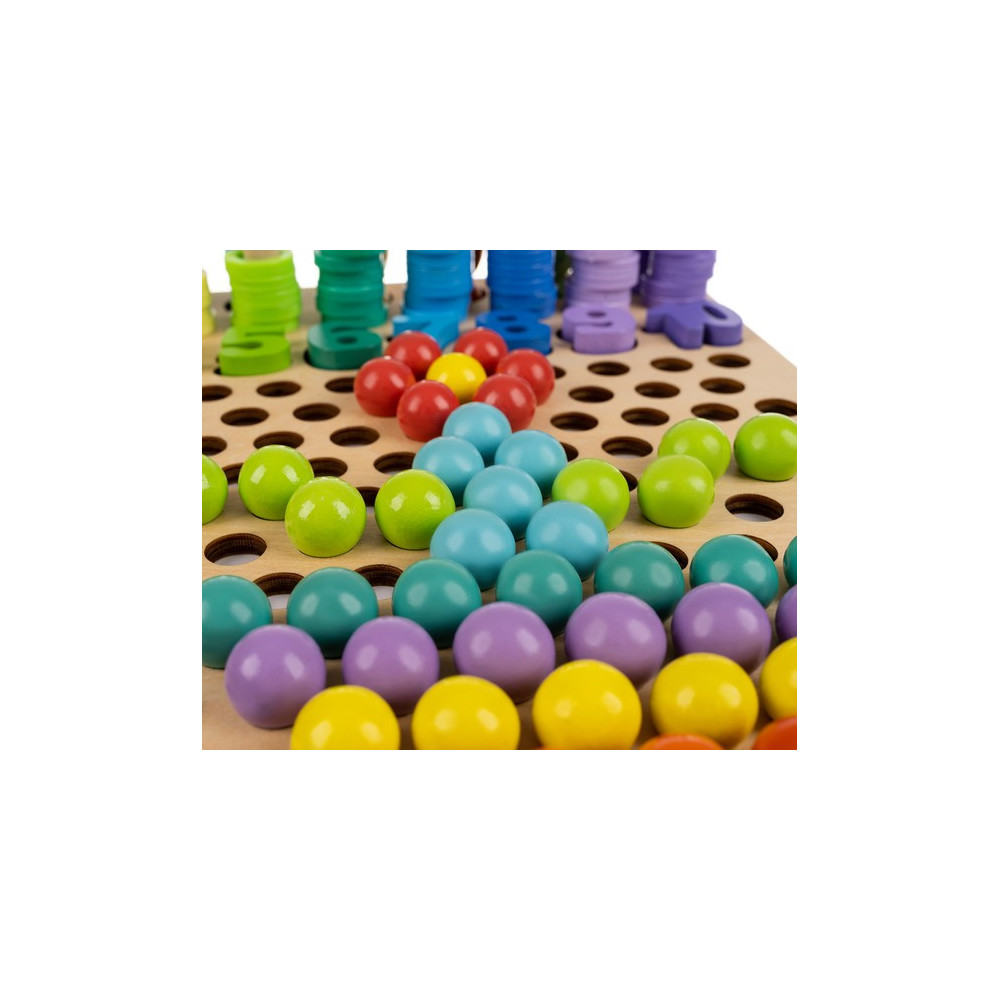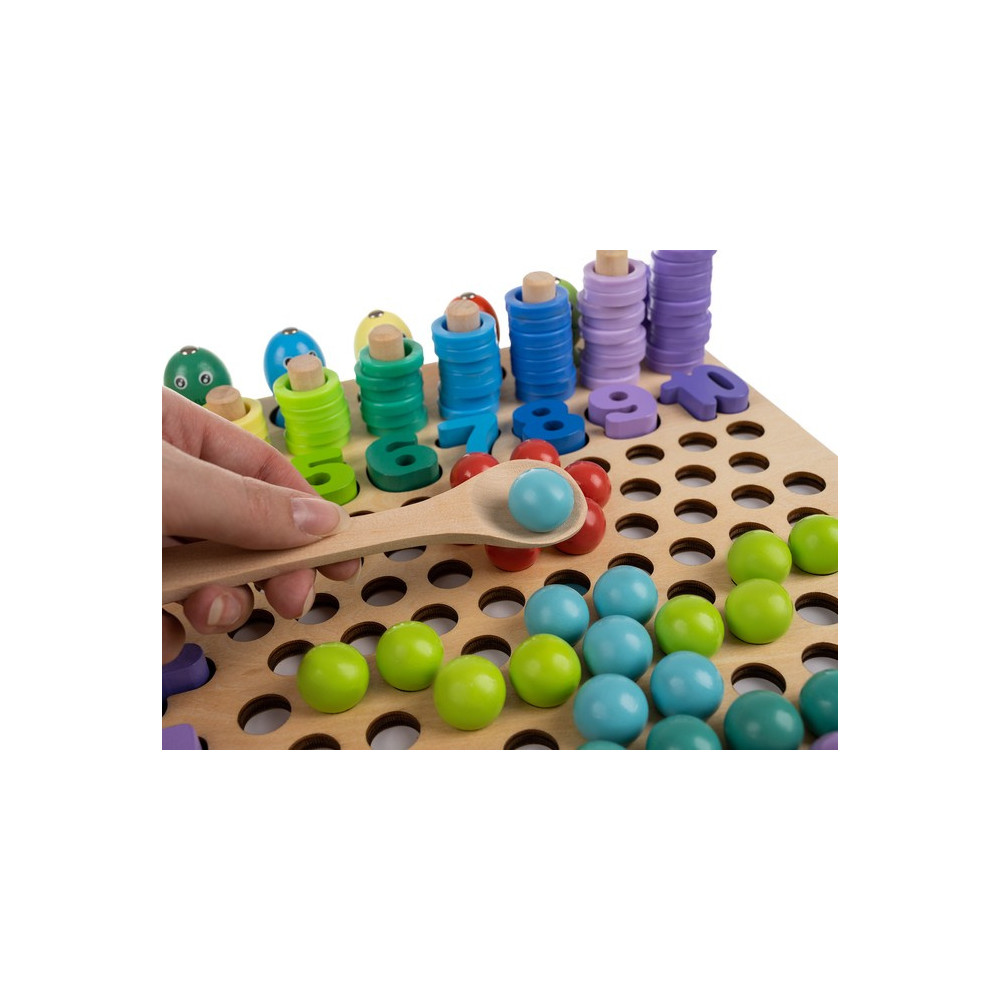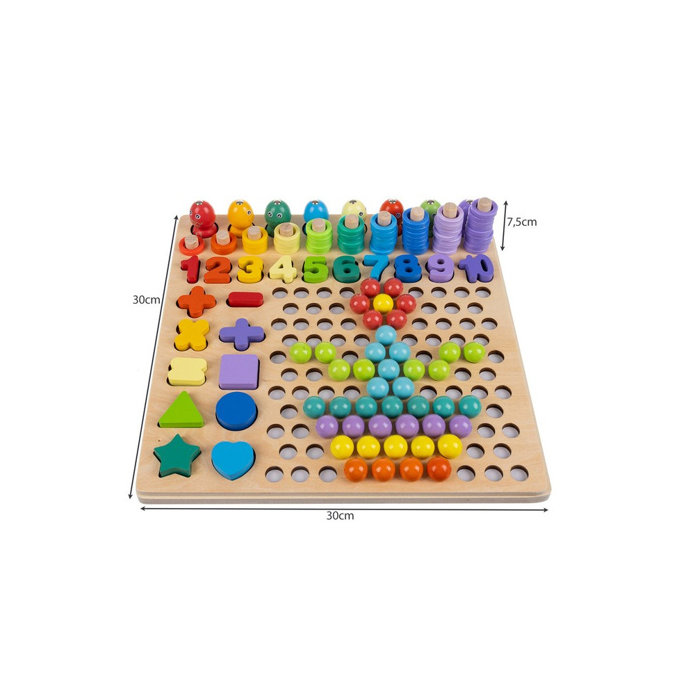 Dřevěná vzdělávací hračka s mozaikou, počítáním, tříděním barev, chytáním rybiček apod. Pomáhá dětem rozvíjet manuální zručnost a představivost a také rozvíjet logické myšlení a koordinaci. Barevnost hračky upoutá pozornost a variabilita her zajistí, že si každý vybere to své.