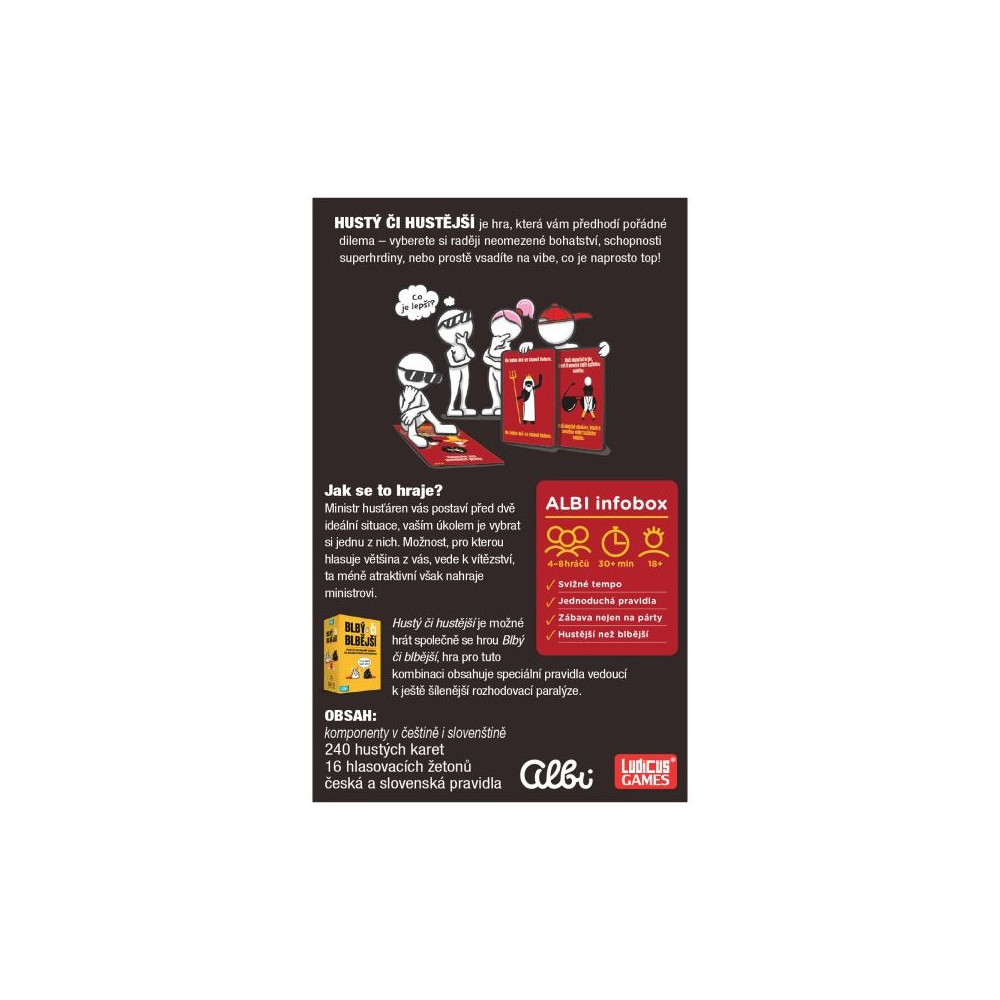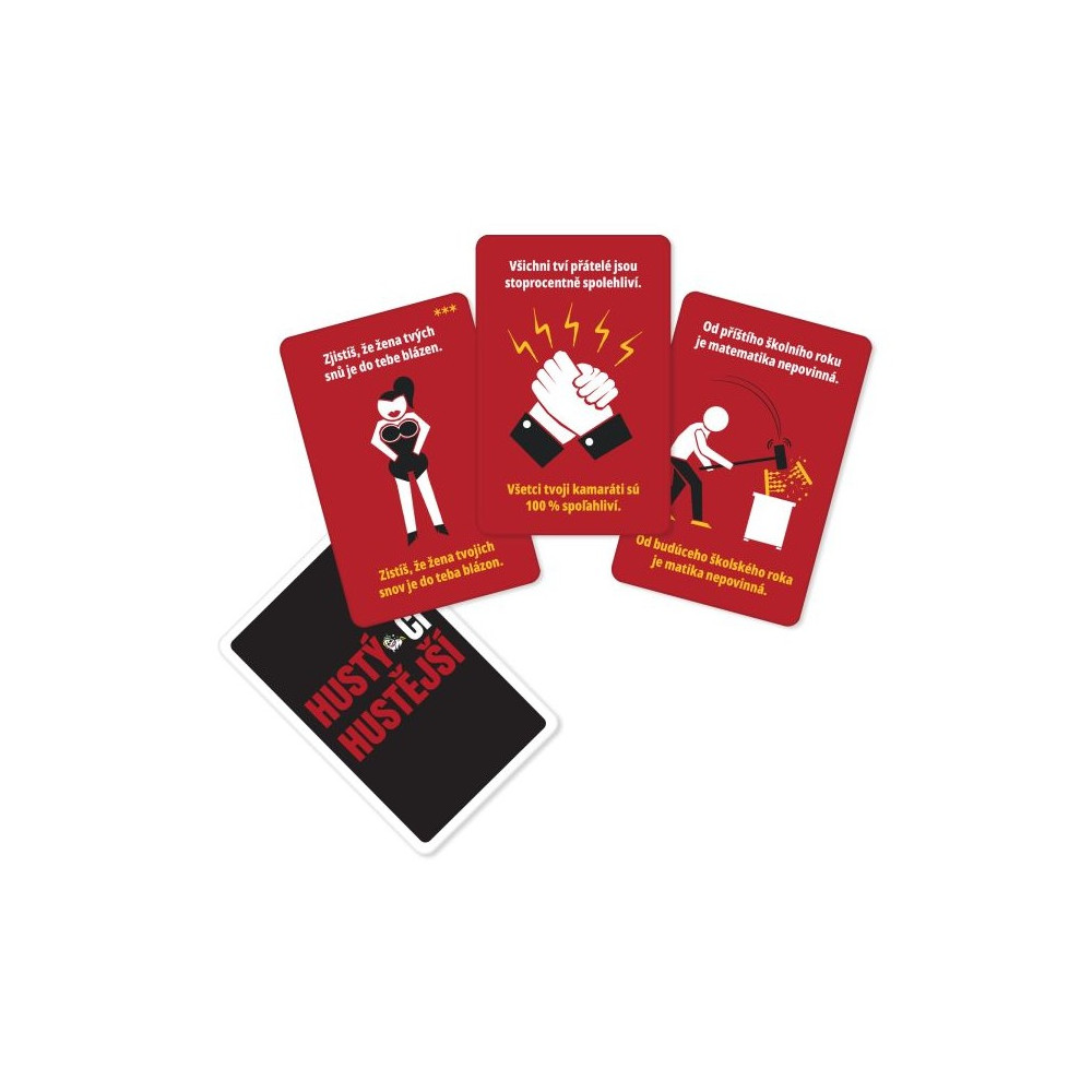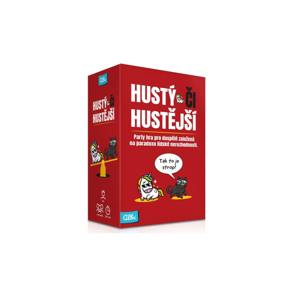 Bylo by lepší, kdyby vám patřilo cokoli, co počůráte, nebo kdybyste mohli být neviditelní? Hustý či hustější je nekorektní párty hra plná nečekaných dilemat, ve které vás možná překvapí, co všechno vaši spoluhráči považují za opravdu hustý.