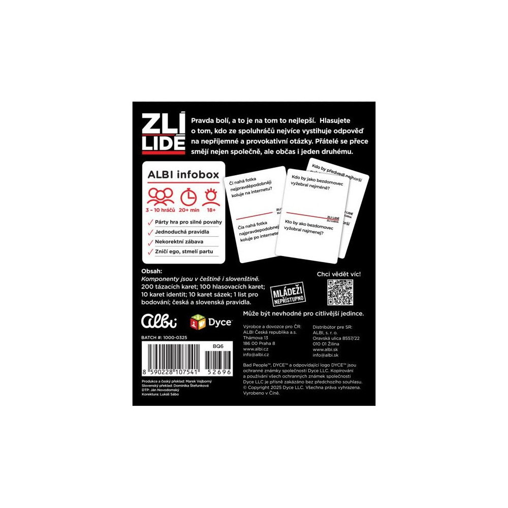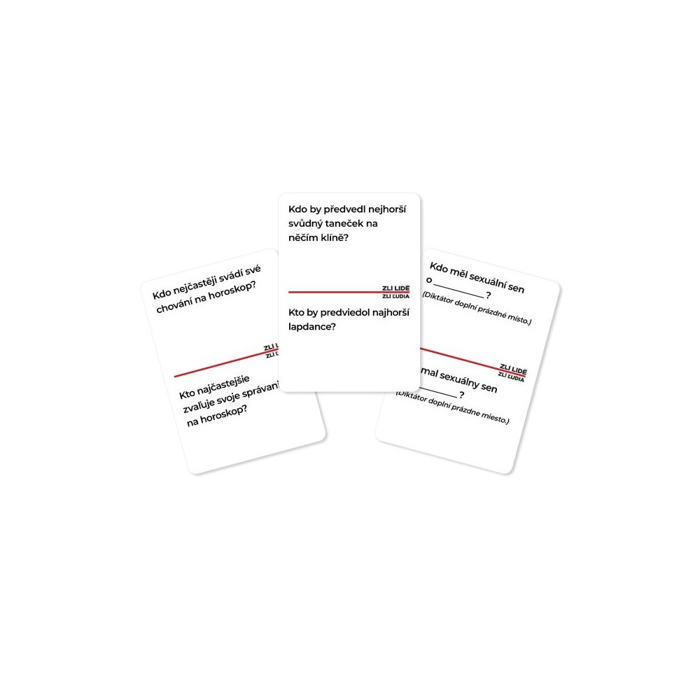 Nekorektní párty hra, která prověří soudržnost vaší skupiny! Pravda bolí, a to je na tom to nejlepší. V párty hře Zlí lidé hlasujete o tom, kdo ze spoluhráčů nejvíce vystihuje odpověď na nepříjemné a provokativní otázky. Přátelé se přece smějí nejen společně, ale občas i jeden druhému.