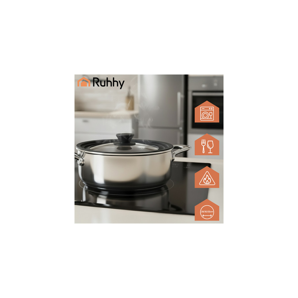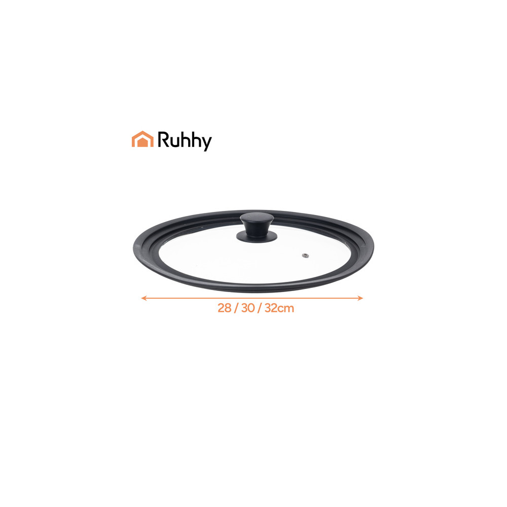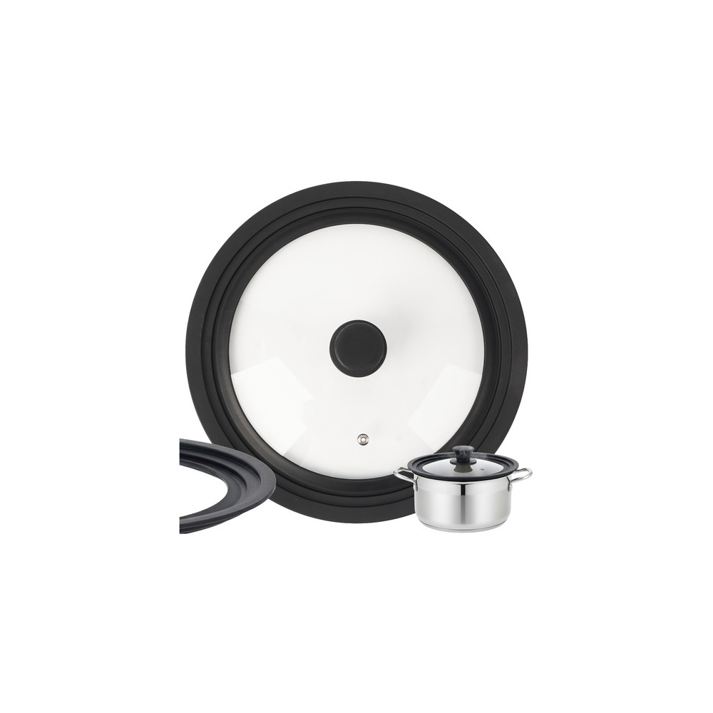 Univerzální poklice se silikonovým okrajem pro hrnce a pánve o průměru 28, 30 a 32 cm. Díky tomu se snadno přizpůsobí a ušetří míso v kuchyni. Robustní konstrukce z tepelně odolného skla a silikonu zajišťuje odolnost, bezpečnost a snadné použití.
