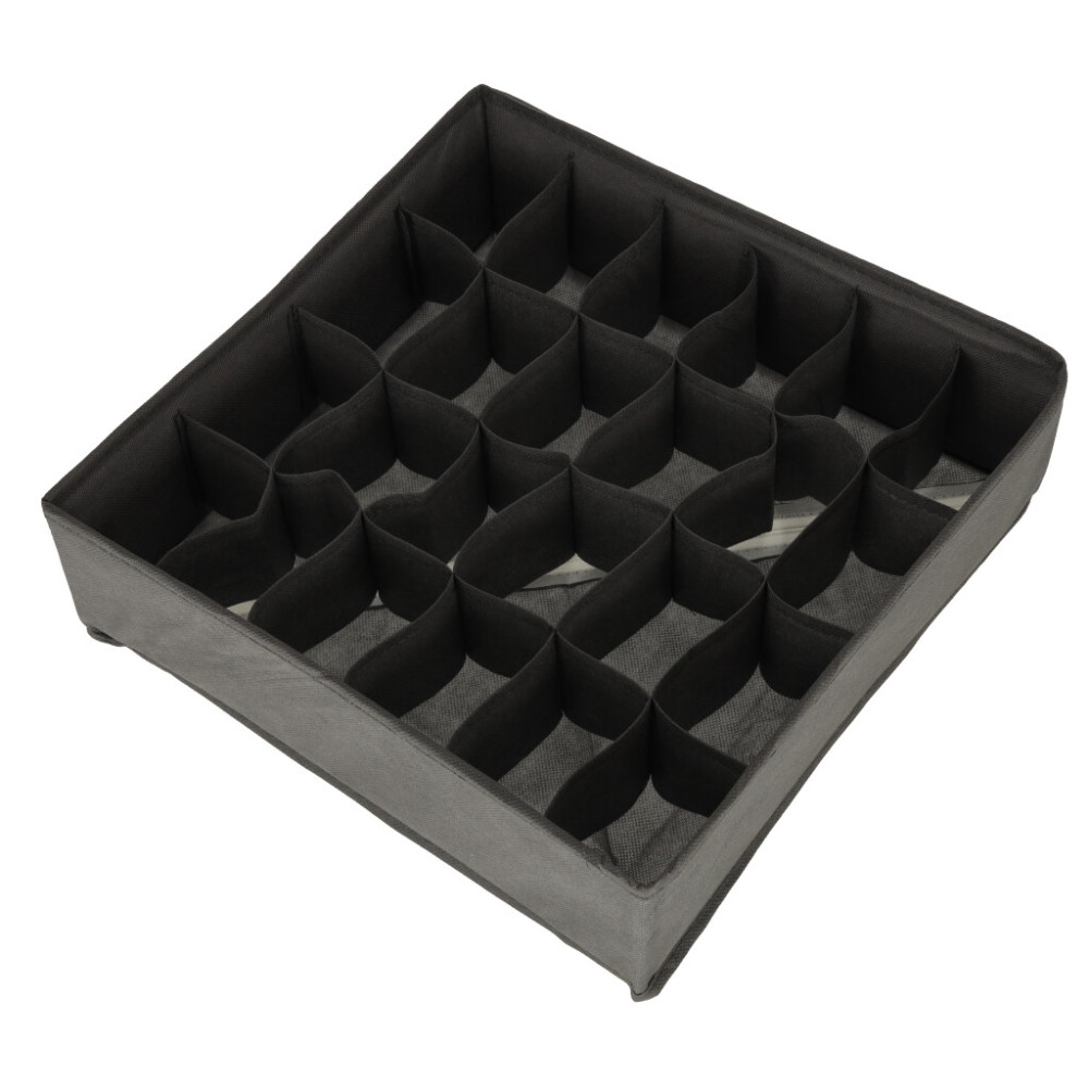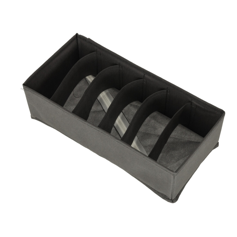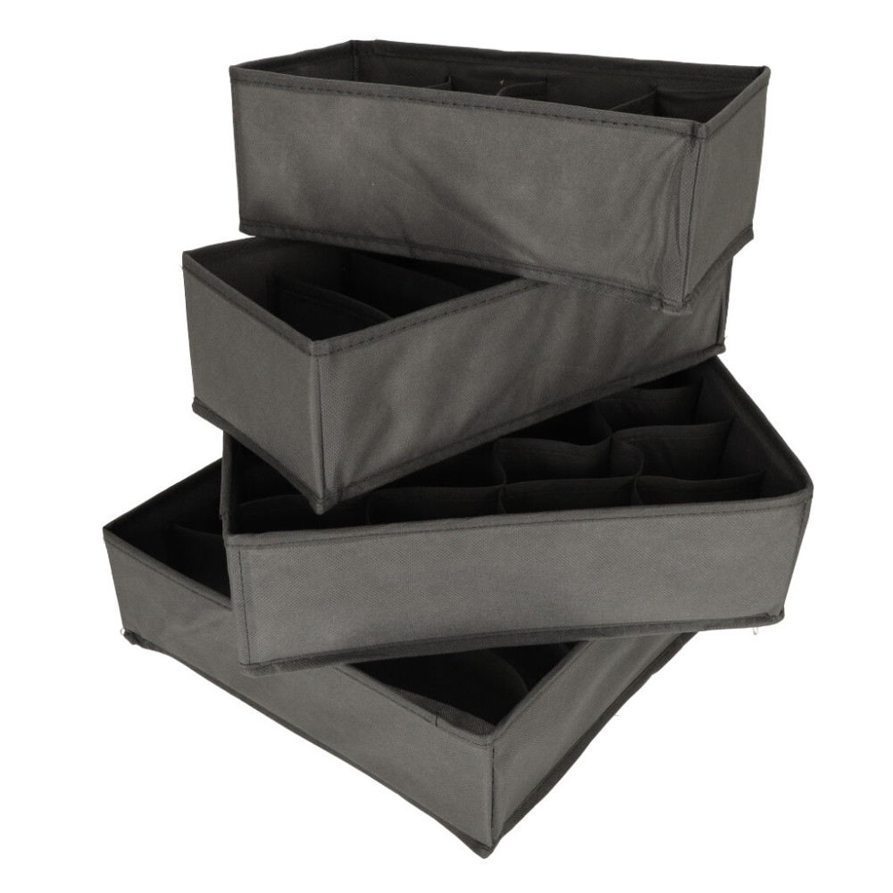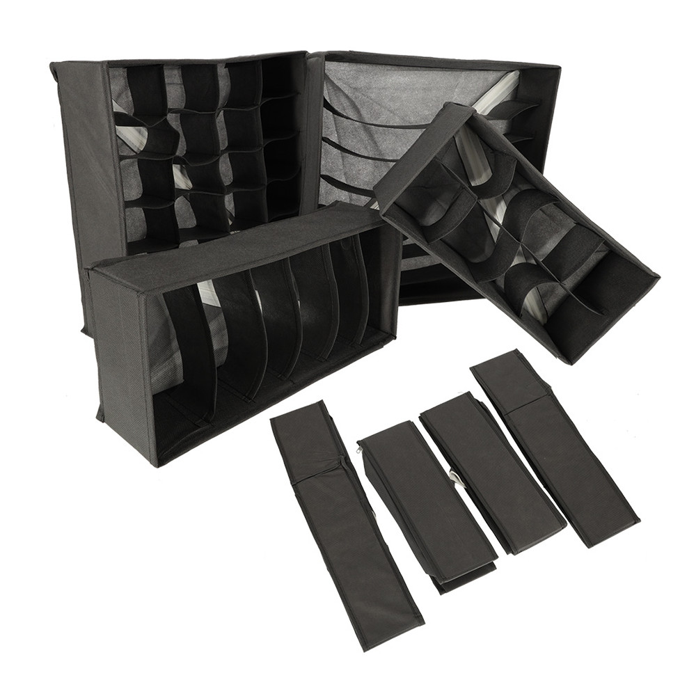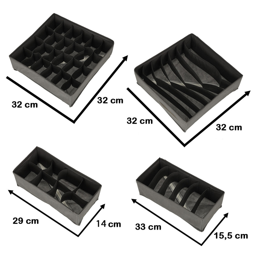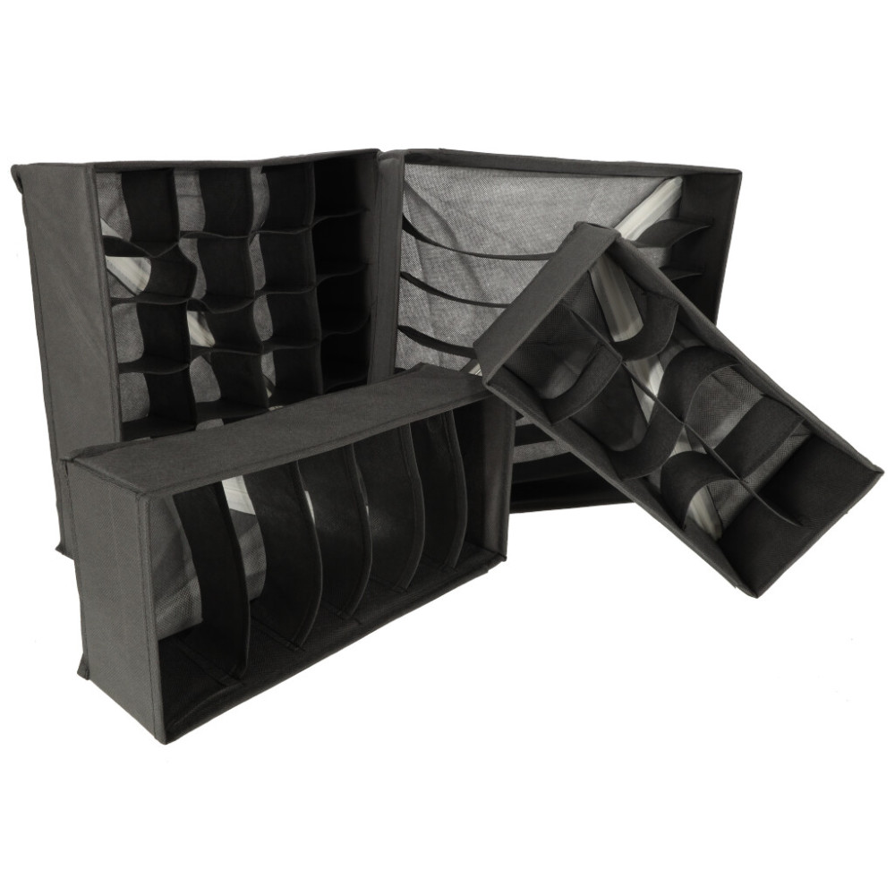 Sada organizérů na spodní prádlo, ponožky a další oblečení. Ideální pomocník při organizaci a přehlednosti skříně. Každý organizér je vyroben z měkkého materiálu a má flexibilní přepážky, díky čemuž je celá sada velkým pomocníkem při organizaci vašich věcí. Použitý materiál má navíc vestavěné výztuhy a velmi snadno se čistí.