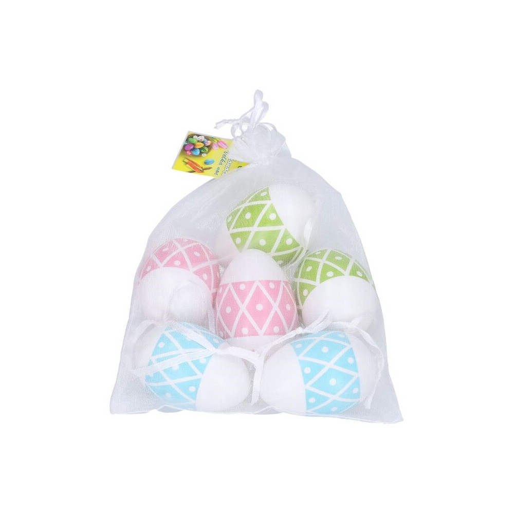 Dekorační plastová vajíčka v praktickém organza sáčku. V balení je dohromady 6 různě malovaných vajíček.