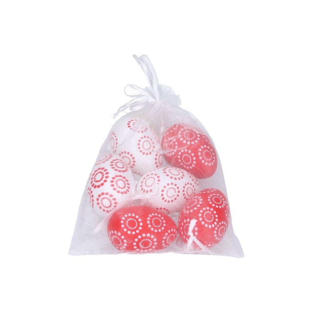Dekorační plastová vajíčka v praktickém organza sáčku. V balení je dohromady 6 různě malovaných vajíček v červenobílé barvě.Materiál: plastRozměr: vajíčko 4 x 6 cm
