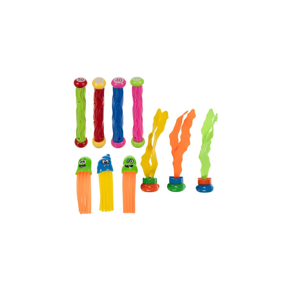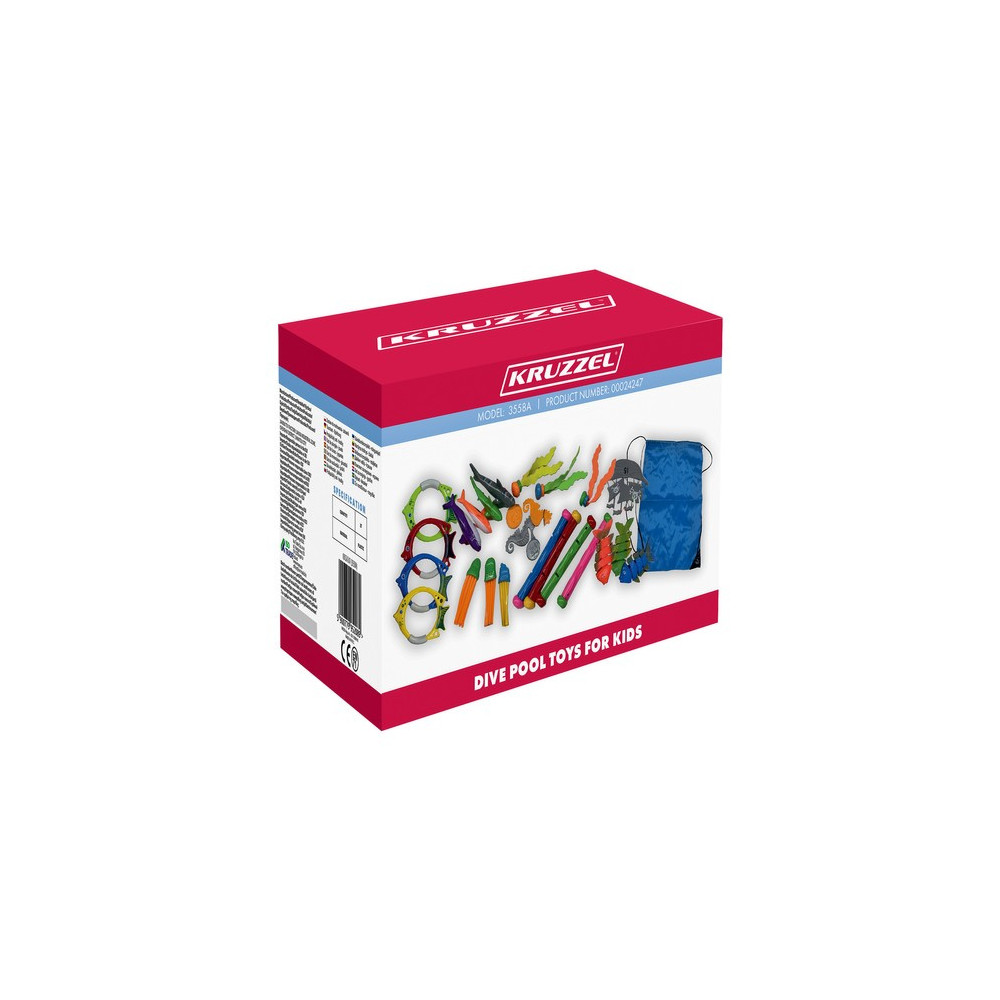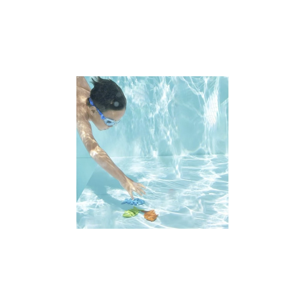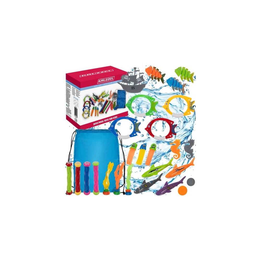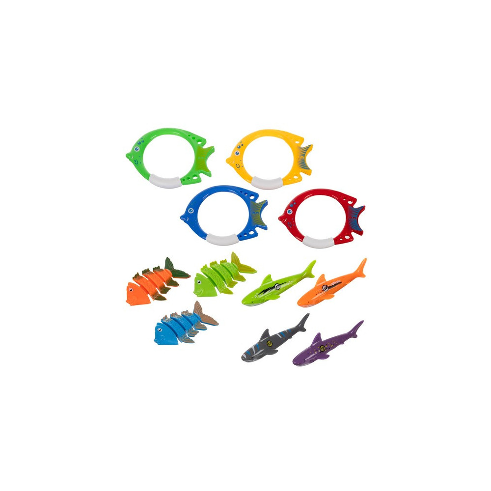 Velká sada hraček na potápění přináší hodiny zábavy pro malé dobrodruhy. Obsahuje 4 velké barevné ryby a 3 menší rybky, které klesají ke dnu a pohybují se proudem vody, což podporuje soutěživé potápění. Součástí jsou také 4 torpéda ve tvaru žraloka a 4 obušky v jasných barvách, které přidávají hře dynamiku a vzrušení. Sada dále obsahuje 3 chobotnice a 3 chrastící mořské řasy, jež vytvářejí realistický podmořský svět a stimulují smysly dětí.