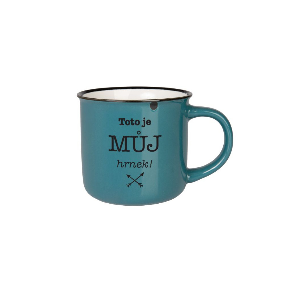 Barevný kameninový hrnek s textem ve vzhledu plecháčku. Výhodou kameniny je, že je těžší, stabilní a dobře udržuje teplo.