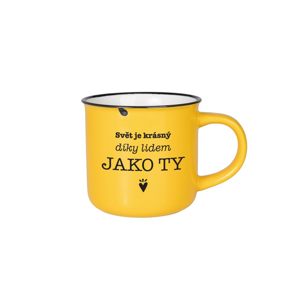 Barevný kameninový hrnek s textem ve vzhledu plecháčku. Výhodou kameniny je, že je těžší, stabilní a dobře udržuje teplo.