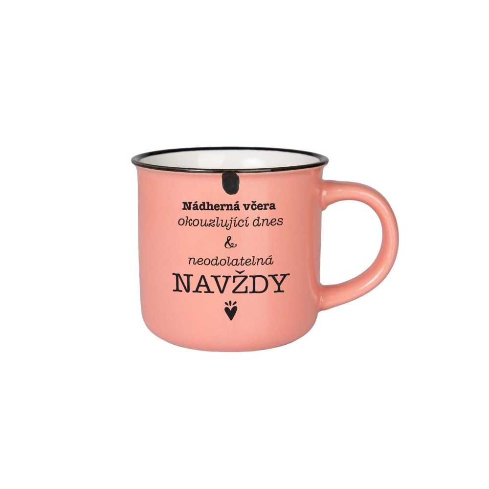 Barevný kameninový hrnek s textem ve vzhledu plecháčku. Výhodou kameniny je, že je těžší, stabilní a dobře udržuje teplo.