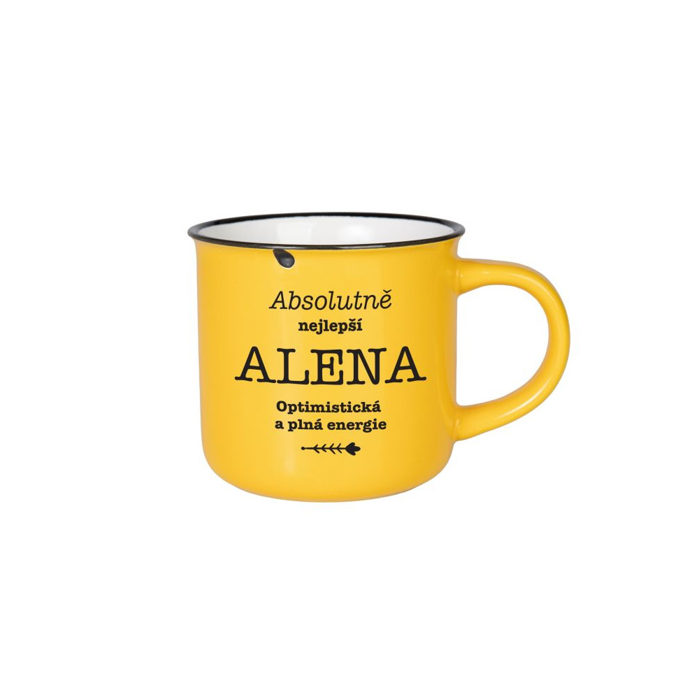 Barevný kameninový hrnek s textem ve vzhledu plecháčku. Výhodou kameniny je, že je těžší, stabilní a dobře udržuje teplo.