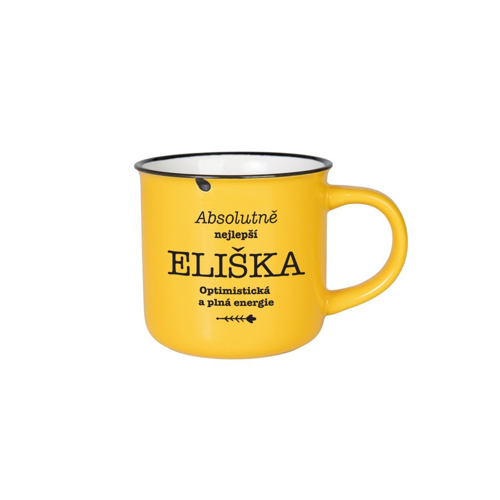 Barevný kameninový hrnek s textem ve vzhledu plecháčku. Výhodou kameniny je, že je těžší, stabilní a dobře udržuje teplo.