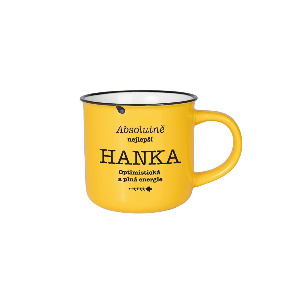Barevný kameninový hrnek s textem ve vzhledu plecháčku. Výhodou kameniny je, že je těžší, stabilní a dobře udržuje teplo.