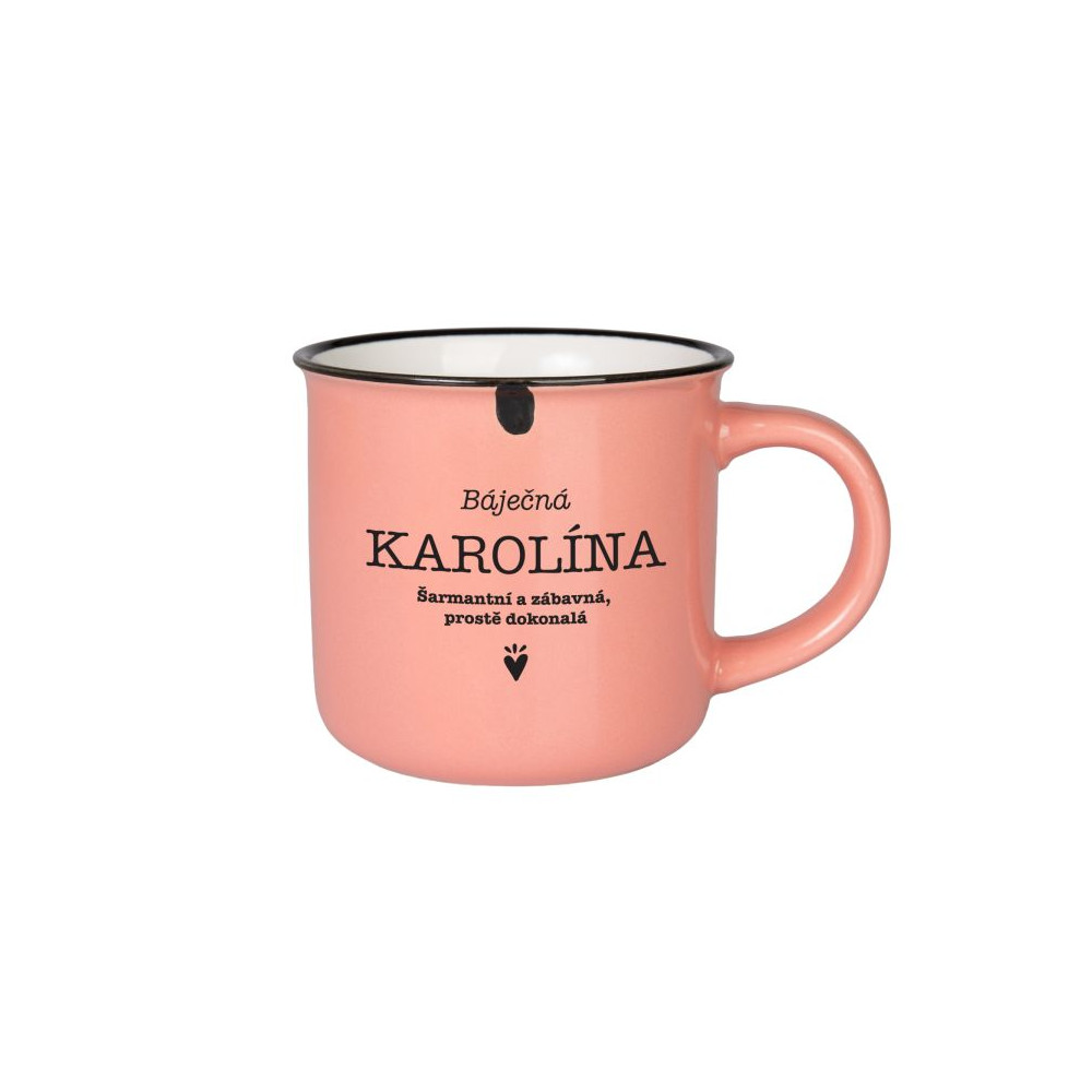 Barevný kameninový hrnek s textem ve vzhledu plecháčku. Výhodou kameniny je, že je těžší, stabilní a dobře udržuje teplo.