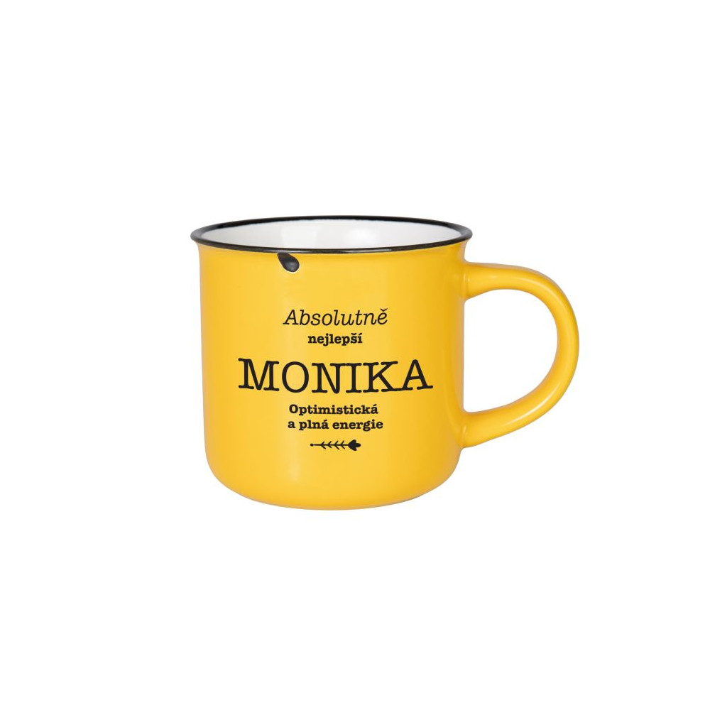 Barevný kameninový hrnek s textem ve vzhledu plecháčku. Výhodou kameniny je, že je těžší, stabilní a dobře udržuje teplo.