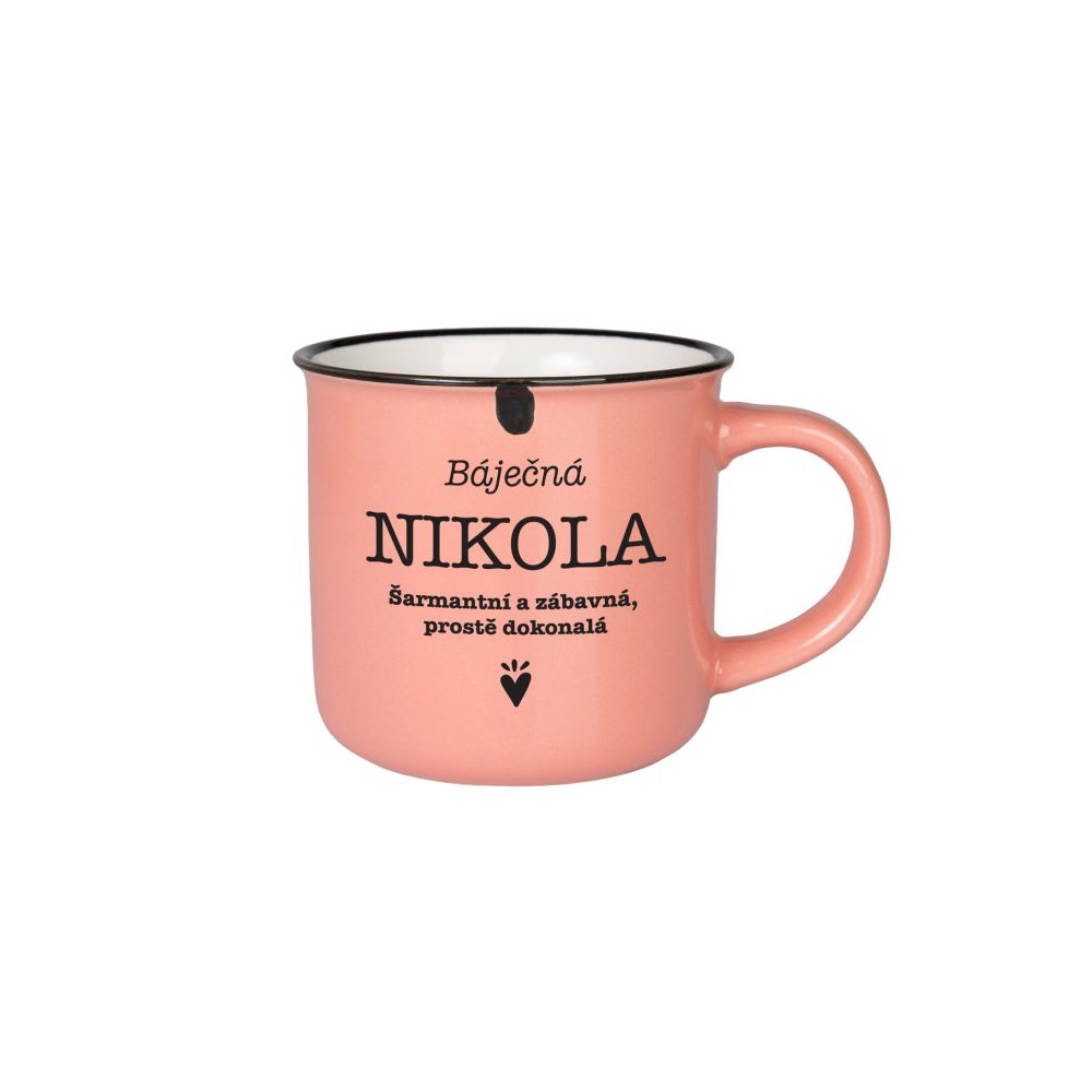 Barevný kameninový hrnek s textem ve vzhledu plecháčku. Výhodou kameniny je, že je těžší, stabilní a dobře udržuje teplo.