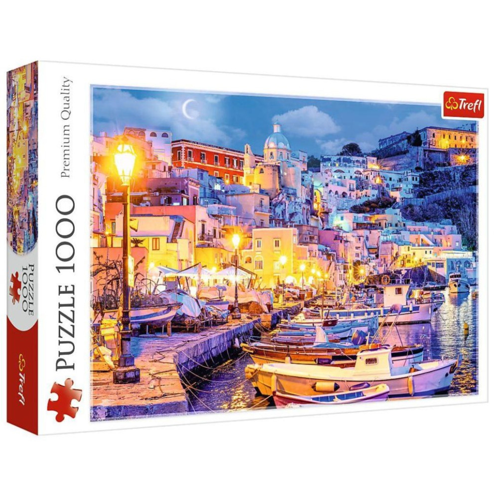Puzzle značky Trefl s motivem nočního přístavu na ostrově Procida v Itálii.