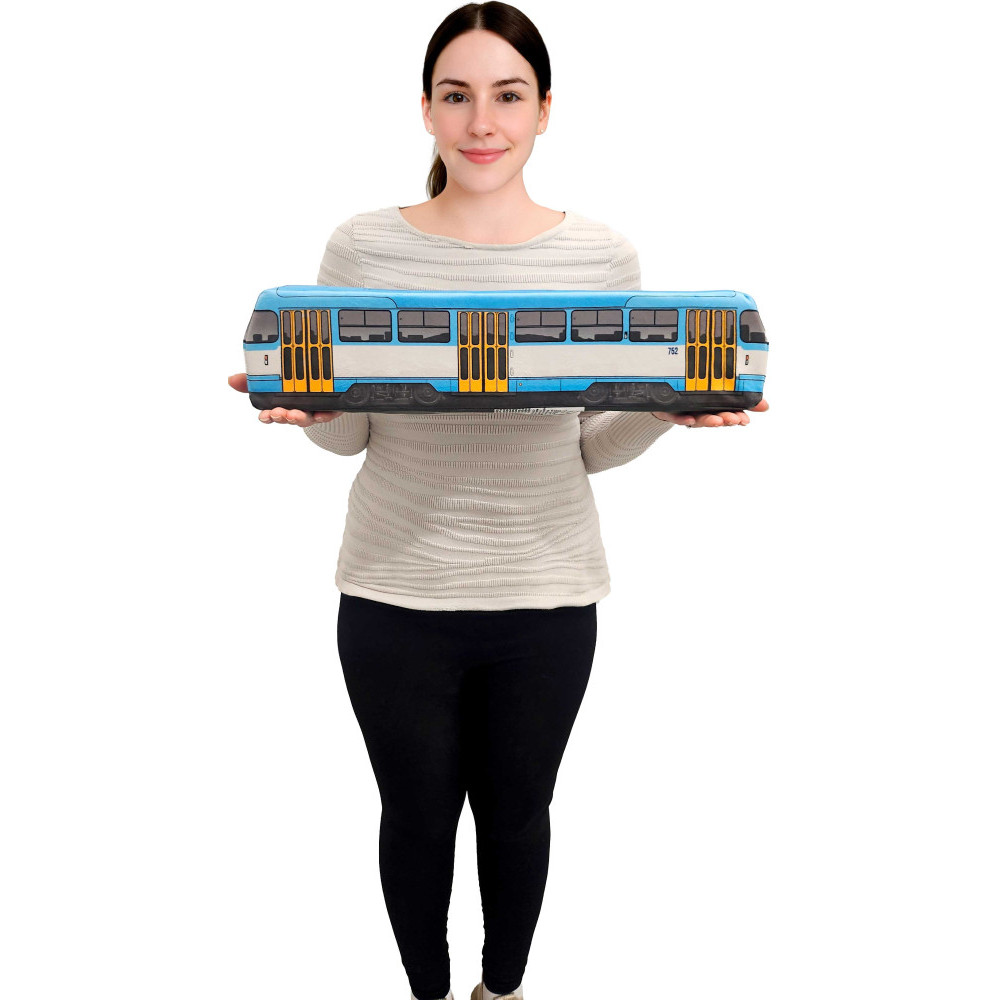 Plyšová tramvaj je vyrobena z příjemného materiálu Velvet, který je heboučký a velmi příjemný na dotek. Uvnitř je pak molitan střední tuhosti, který zajistí příjemný komfort při ležení na hračce. Povlak je snímatelný se zipem ve spodní části hračky.