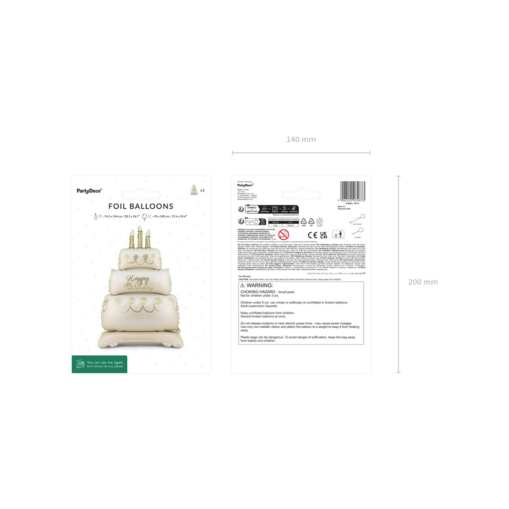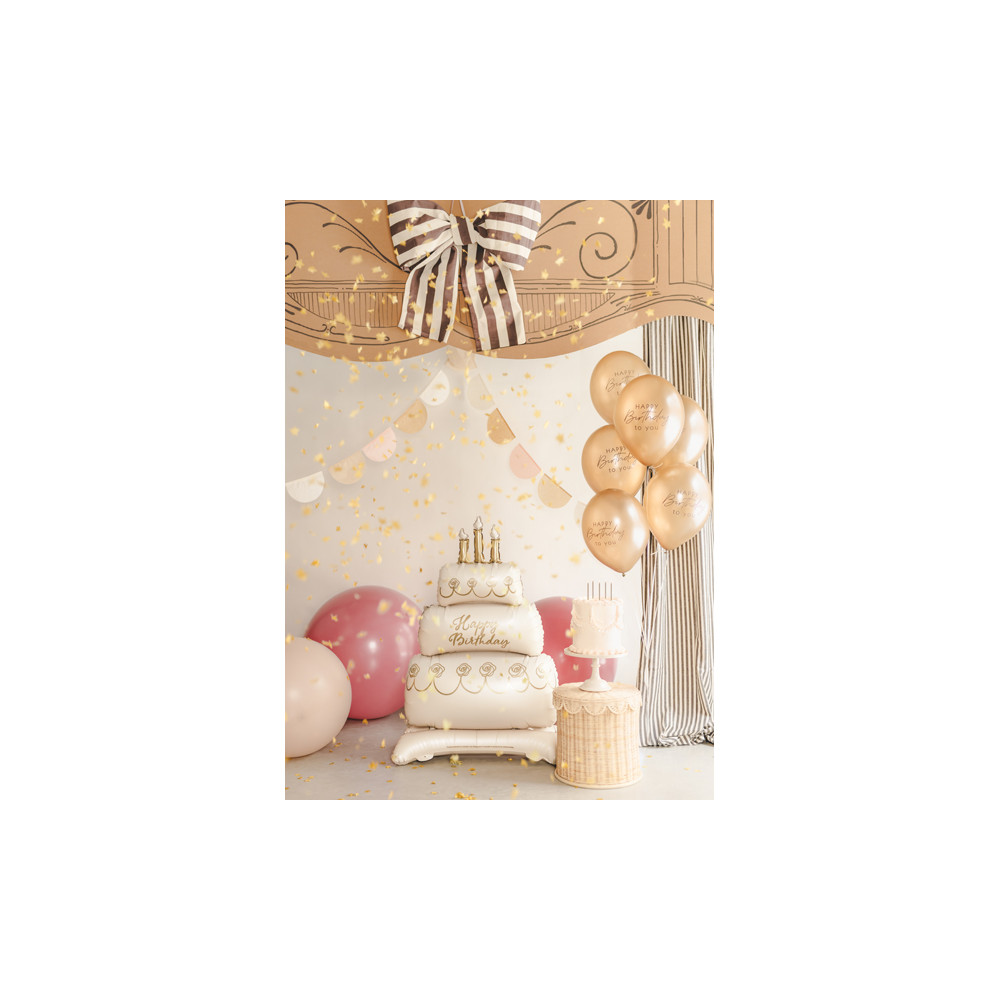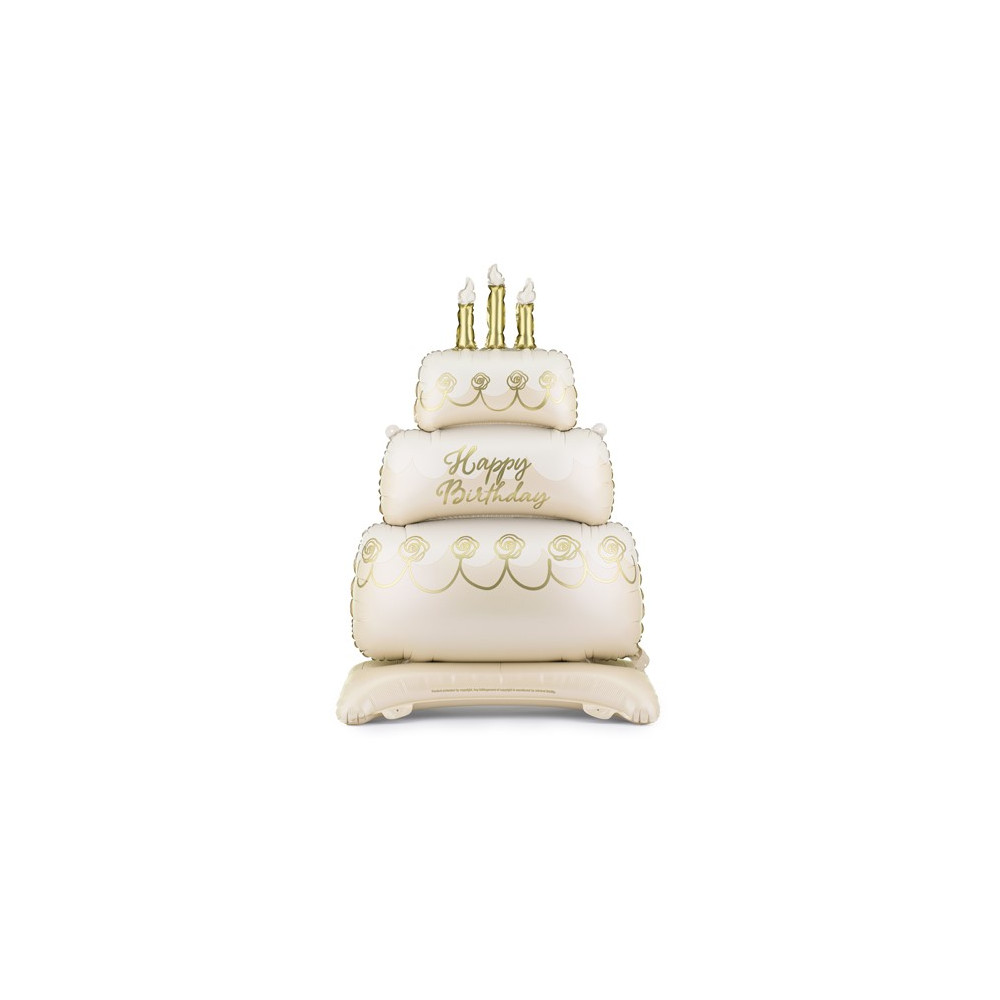 Nafukovací fóliový balónek se stojánkem ve tvaru krémového dortu k narozeninám se zlatými dekoracemi a nápisem Happy Birthday.