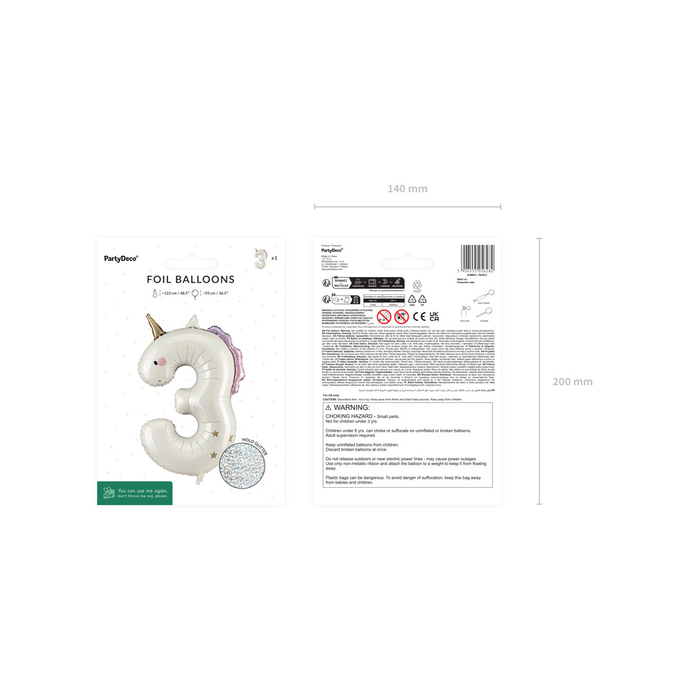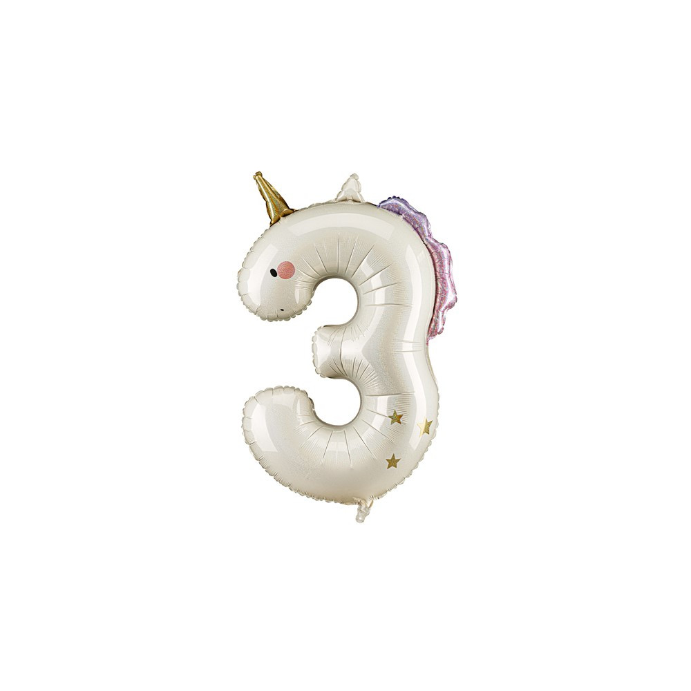 Fóliový nafukovací balónek s číslicí v designu jednorožce s holografickým efektem, s růžovými a zlatými detaily.