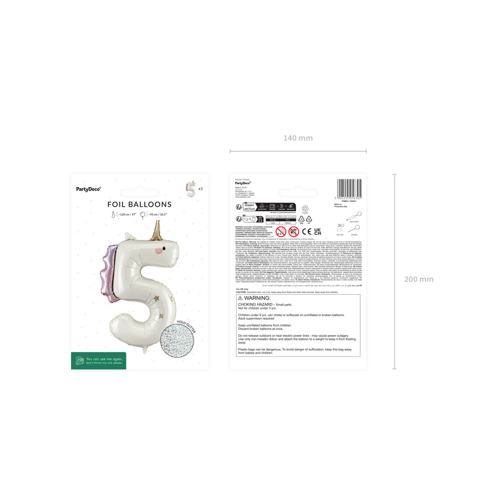 Fóliový nafukovací balónek s číslicí v designu jednorožce s holografickým efektem, s růžovými a zlatými detaily.