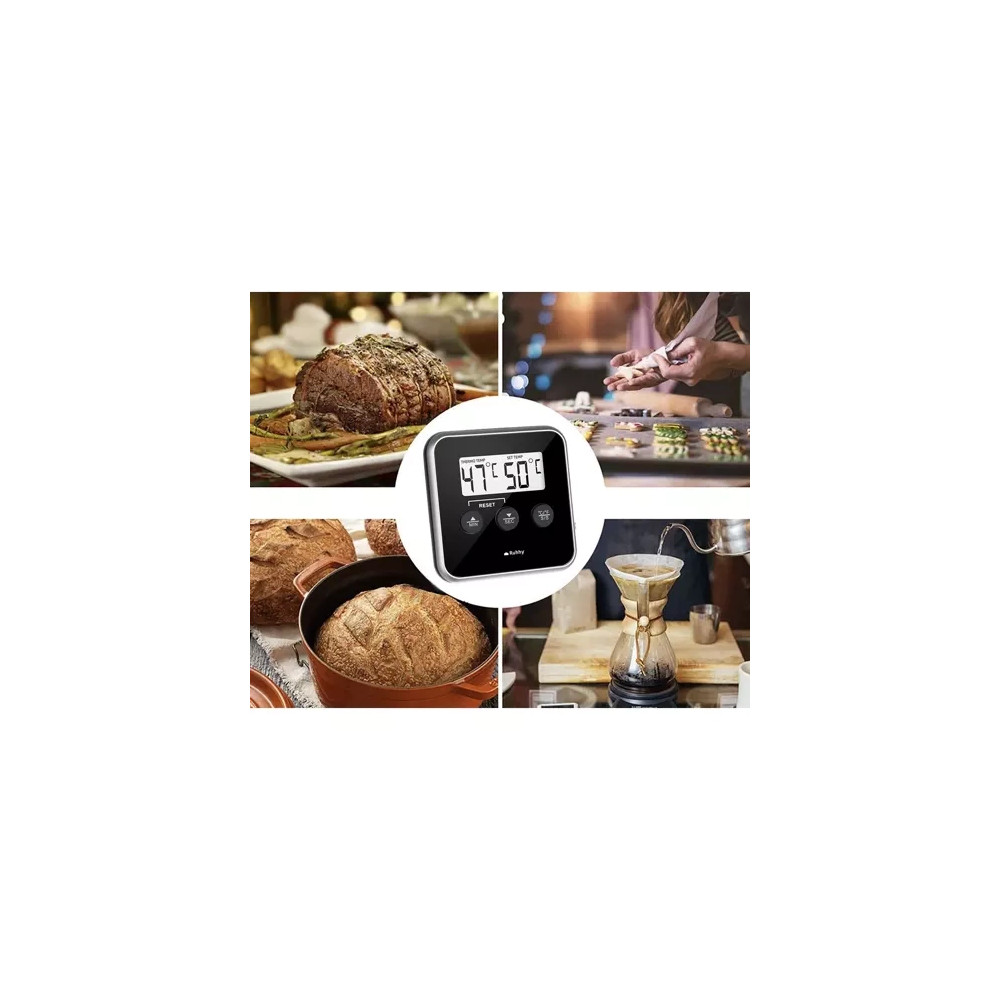 Tepelně odolná nerezová sonda je umístěna na dlouhém kabelu, což zajišťuje bezpečné a pohodlné měření i při vysokých teplotách. Funkce „lock“ umožňuje nepřetržité sledování teploty a po dosažení nastavené hodnoty vás zařízení upozorní zvukovým alarmem.