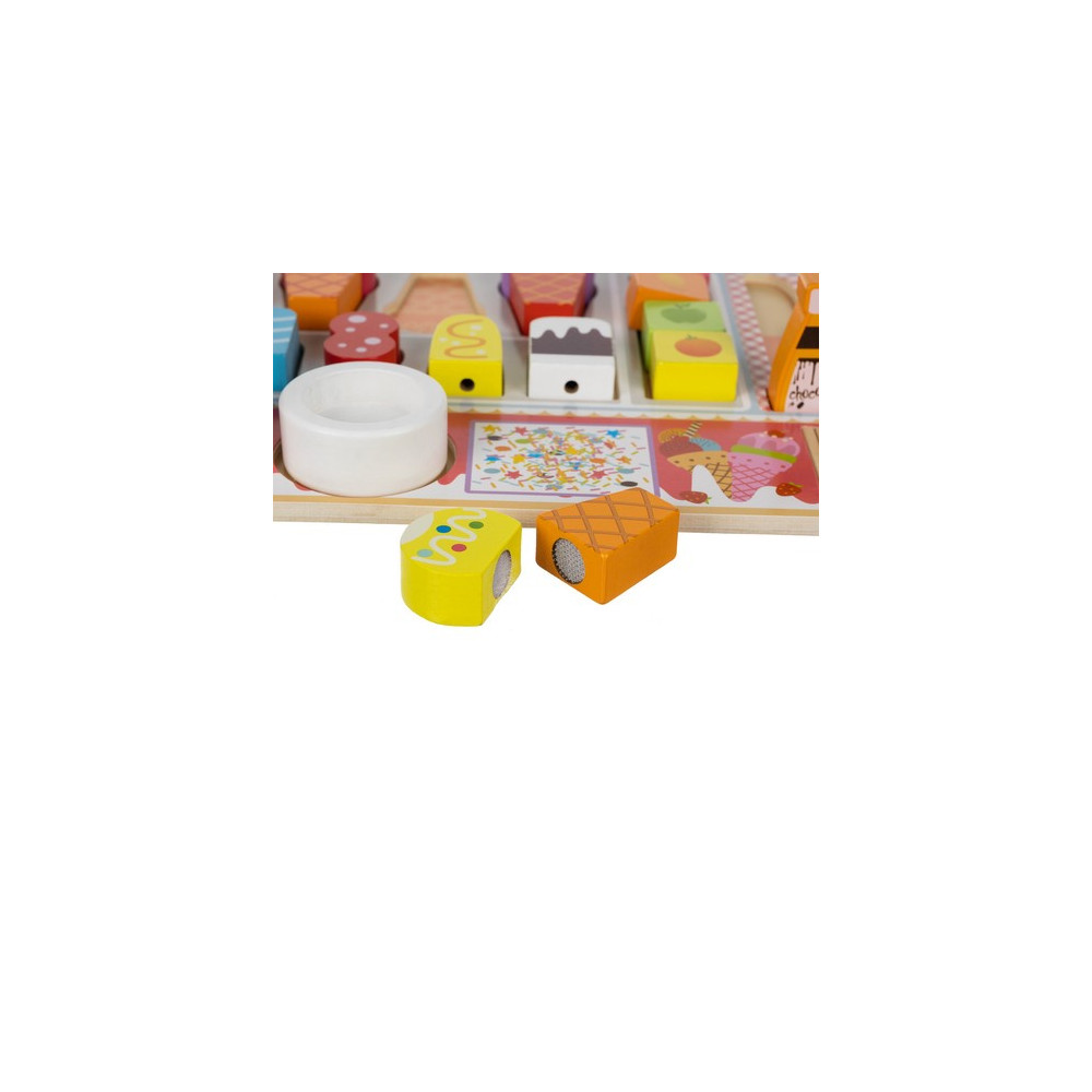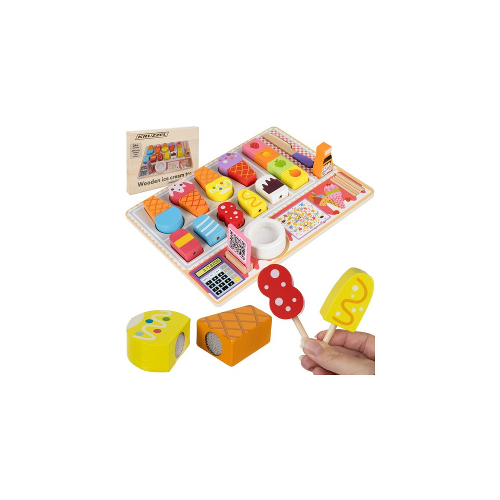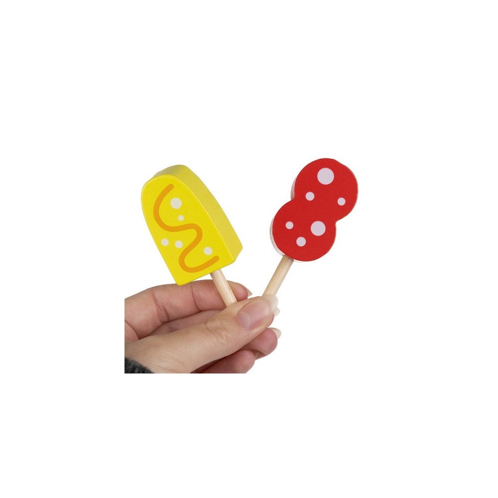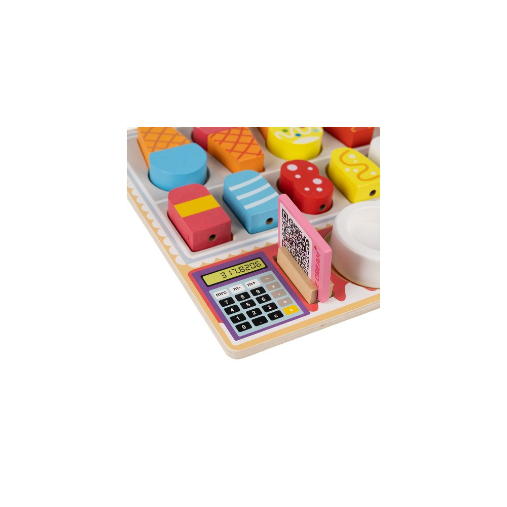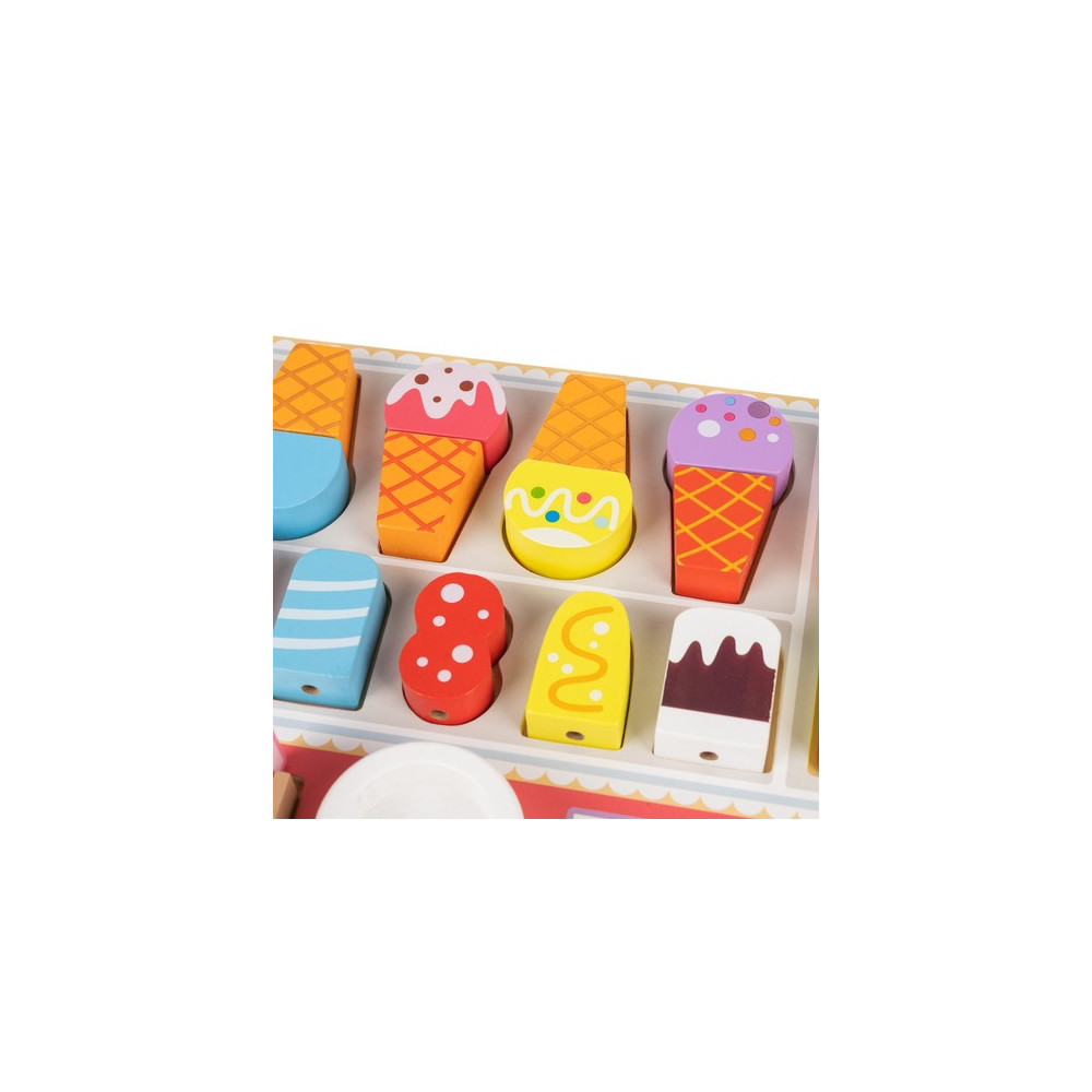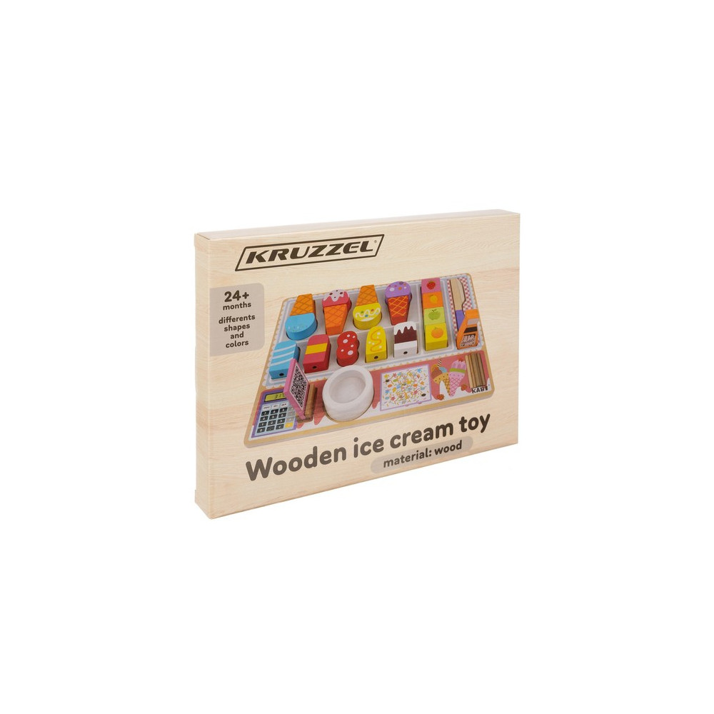 Dřevěná zmrzlinárna je zábavná a vzdělávací hračka, která děti učí barvy, tvary a velikosti zmrzlinových kornoutů. Jasné barvy a různorodé tvary stimulují kognitivní schopnosti, zatímco hmotnost a textura dřevěných prvků podporují smyslový a senzorický vývoj dítěte. Hračka zároveň rozvíjí jemnou motoriku a trpělivost při skládání zmrzliny na špejli.