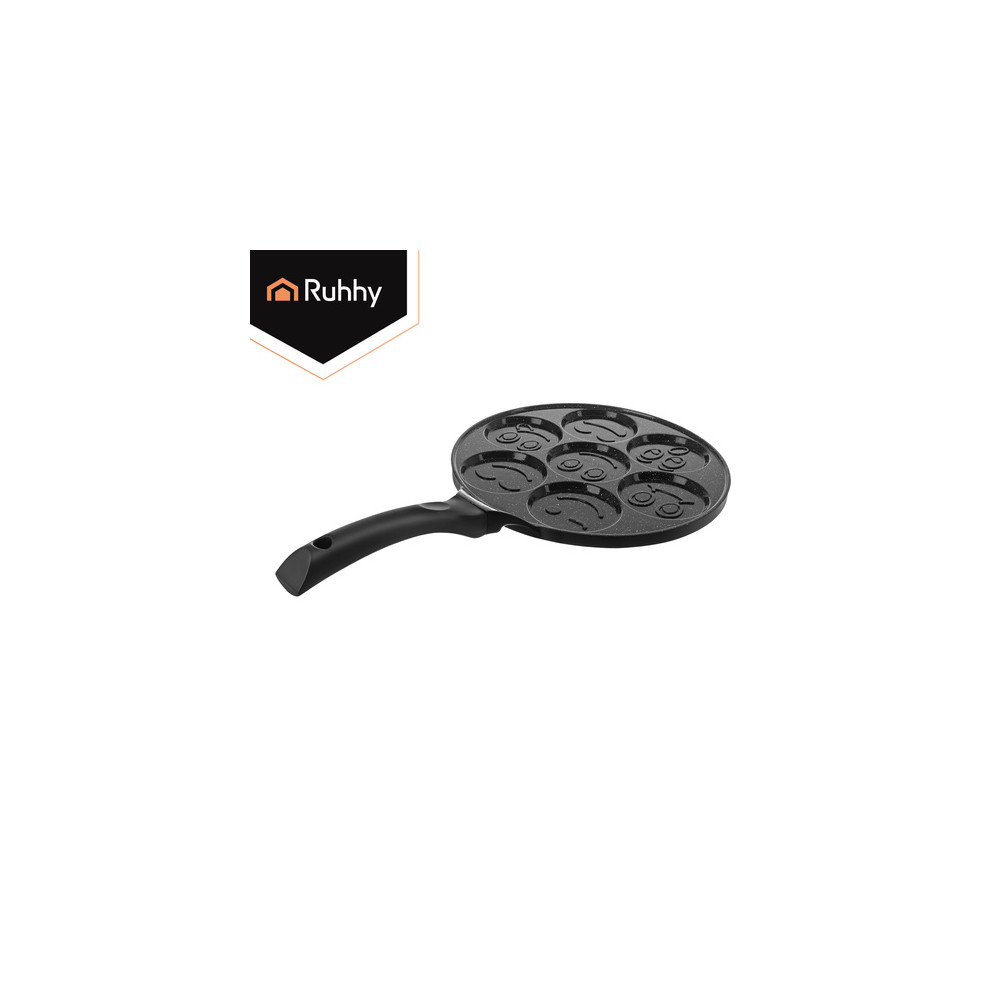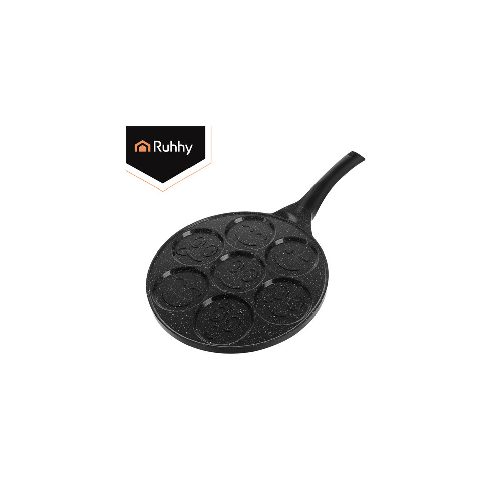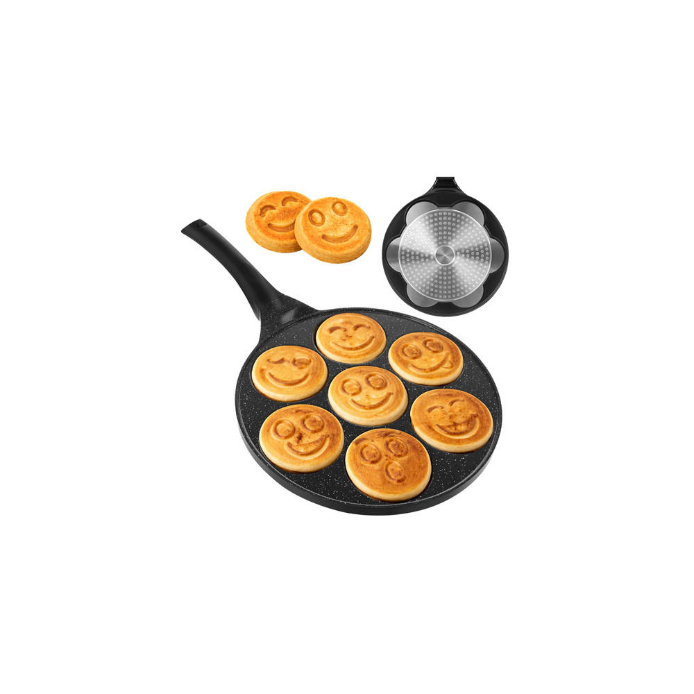 Pánev s vyraženými smajlíky je vhodná pro přípravu snídaní i sladkých dezertů. Díky speciálnímu tvaru umožňuje připravit až 7 palačinek nebo lívanců najednou. Nepřilnavý keramický povrch zabraňuje připalování a umožňuje smažení s minimálním množstvím tuku. Pánev je vyrobena z kvalitního hliníku, který zajišťuje rovnoměrné rozložení tepla a perfektní propečení. Univerzální dno je kompatibilní s indukčními, plynovými, elektrickými i sklokeramickými sporáky. Ergonomická rukojeť s chladným povrchem zvyšuje bezpečnost a komfort při manipulaci. Veselé motivy obličejů na jednotlivých formách navíc potěší děti i dospělé a promění každou snídani v zábavný zážitek.
