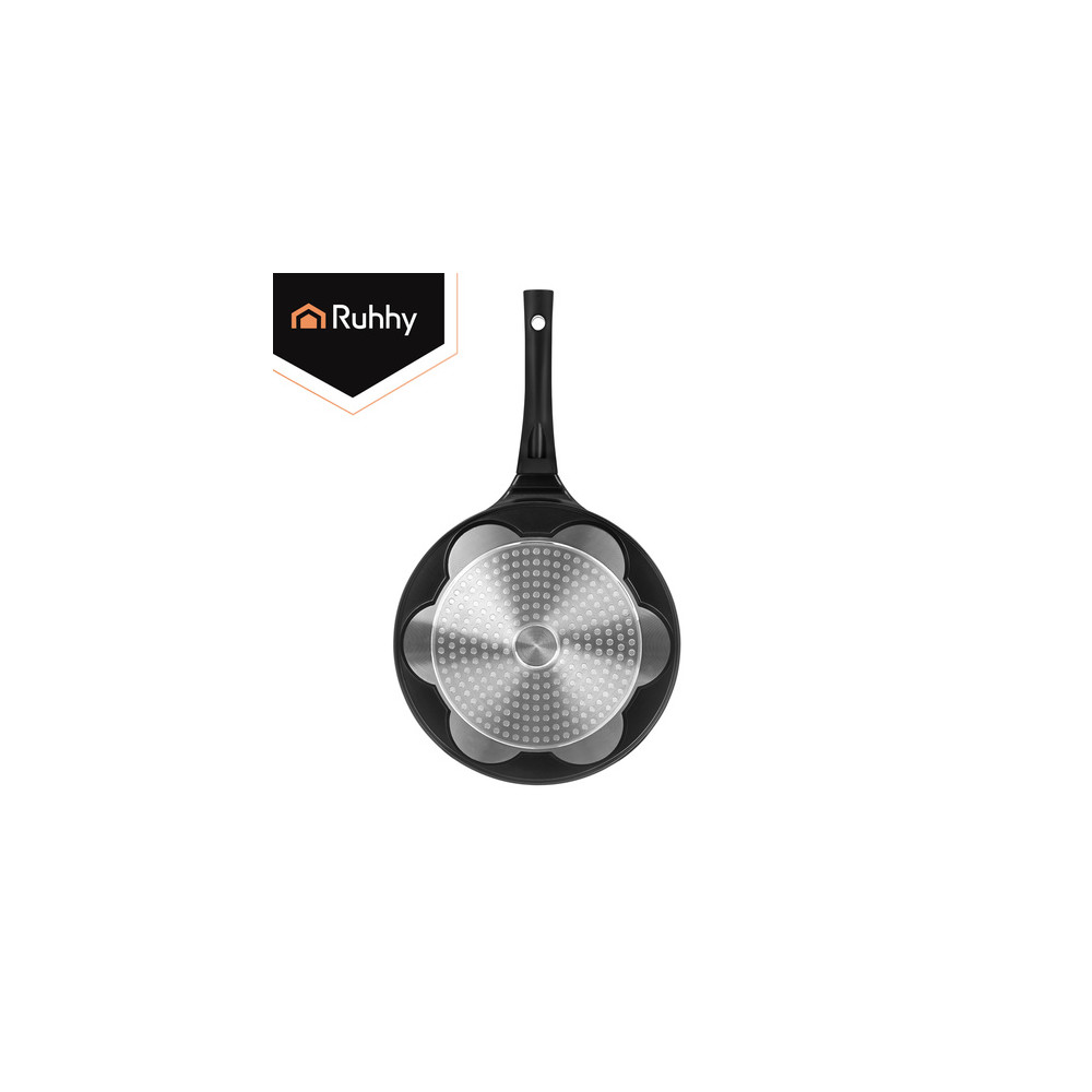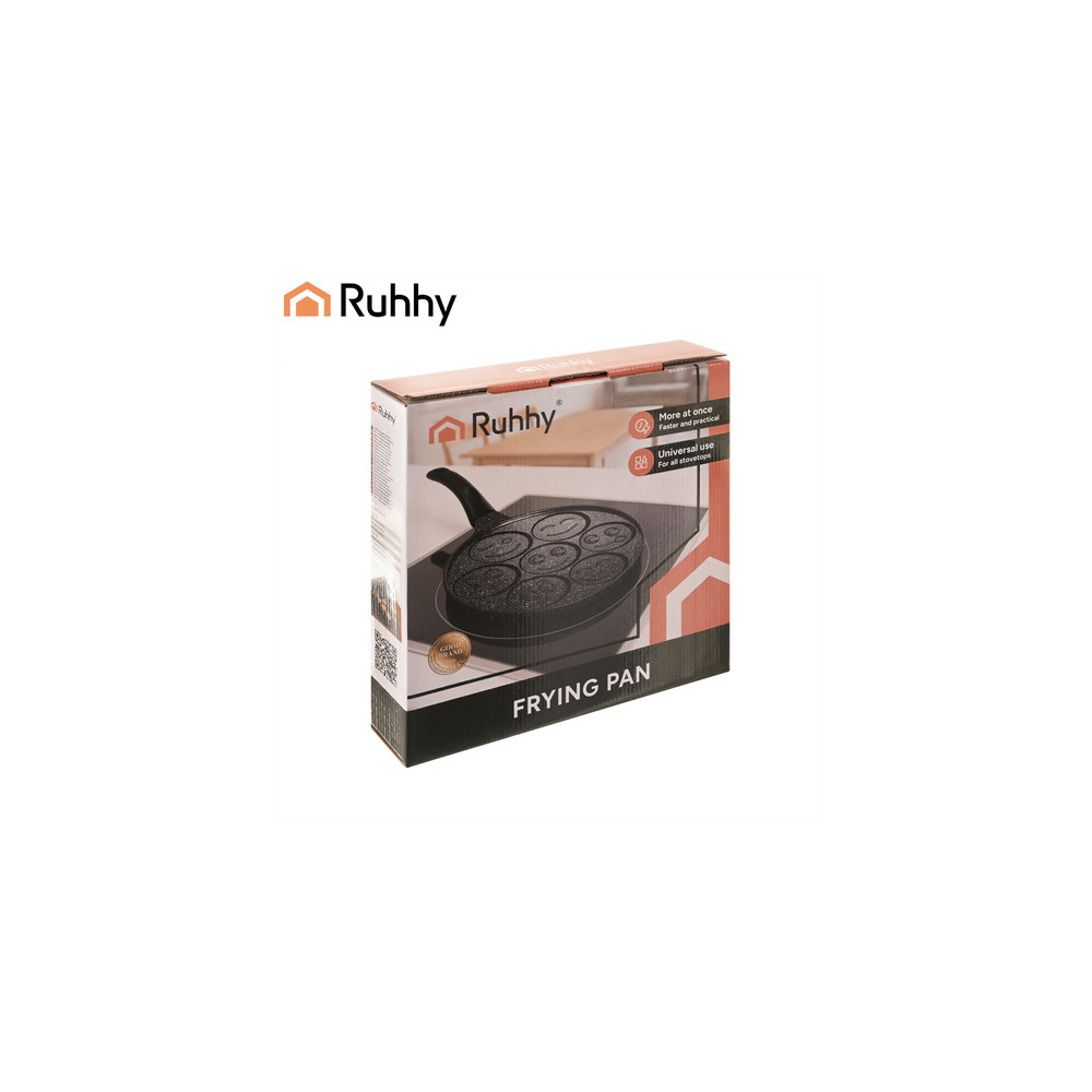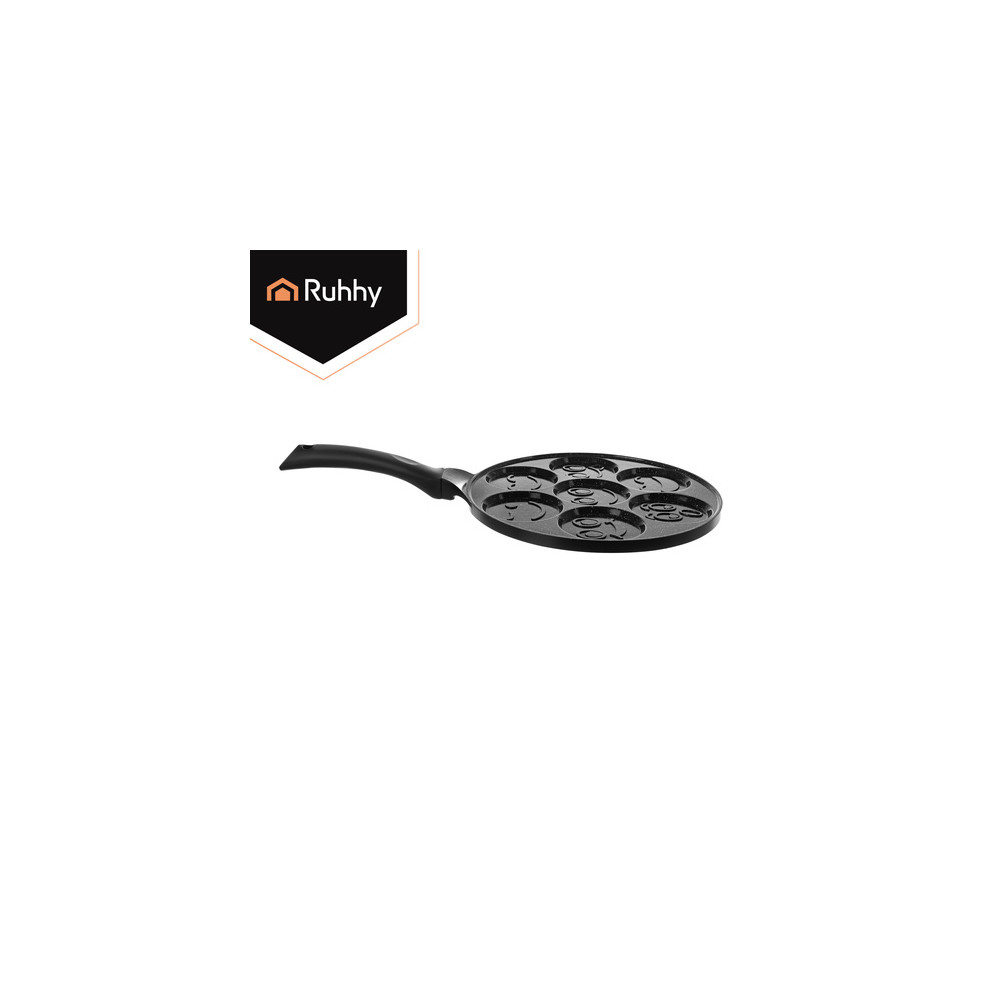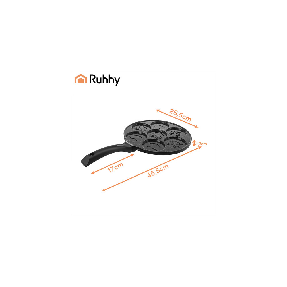 Pánev s vyraženými smajlíky je vhodná pro přípravu snídaní i sladkých dezertů. Díky speciálnímu tvaru umožňuje připravit až 7 palačinek nebo lívanců najednou. Nepřilnavý keramický povrch zabraňuje připalování a umožňuje smažení s minimálním množstvím tuku. Pánev je vyrobena z kvalitního hliníku, který zajišťuje rovnoměrné rozložení tepla a perfektní propečení. Univerzální dno je kompatibilní s indukčními, plynovými, elektrickými i sklokeramickými sporáky. Ergonomická rukojeť s chladným povrchem zvyšuje bezpečnost a komfort při manipulaci. Veselé motivy obličejů na jednotlivých formách navíc potěší děti i dospělé a promění každou snídani v zábavný zážitek.
