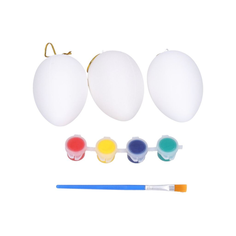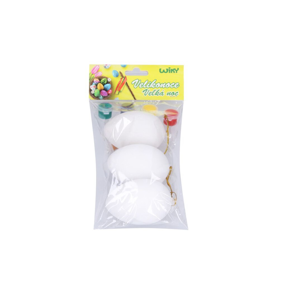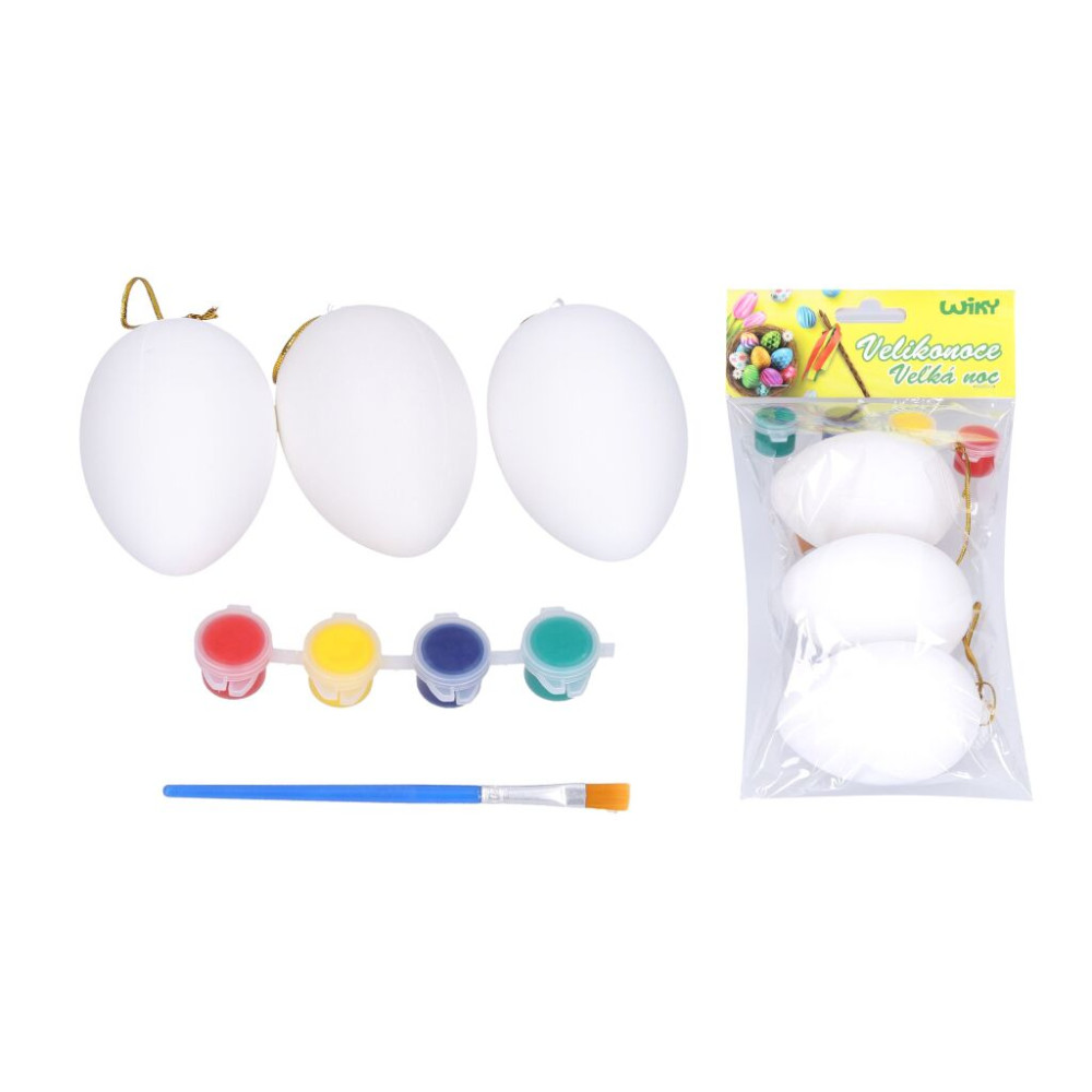 Vajíčka plastové na vybarvení o velikosti 5x8 cm 3 ks. Součástí balení jsou barvy a štětec.