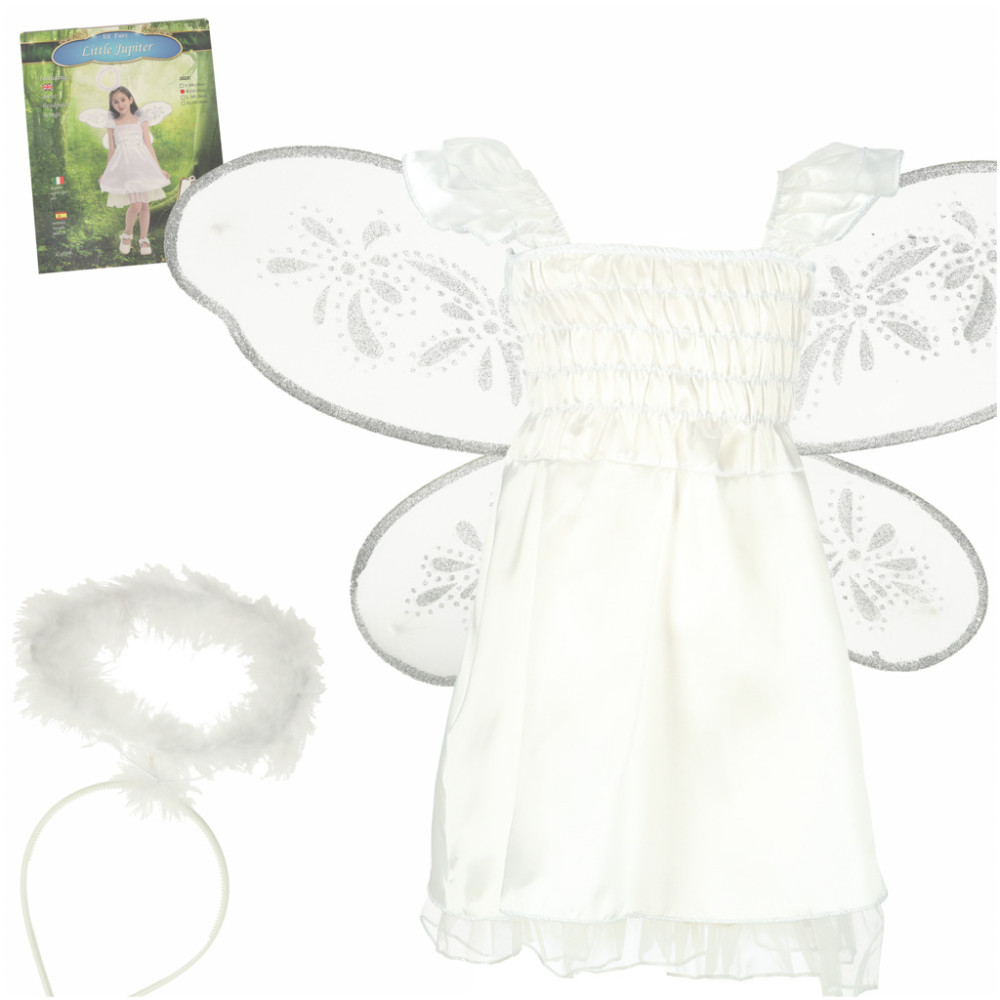 Dětský karnevalový kostým v motivu roztomilého anděla se svatozáří v bílé barvě. Součástí balení jsou šaty, křídla a čelenka se svatozáří.