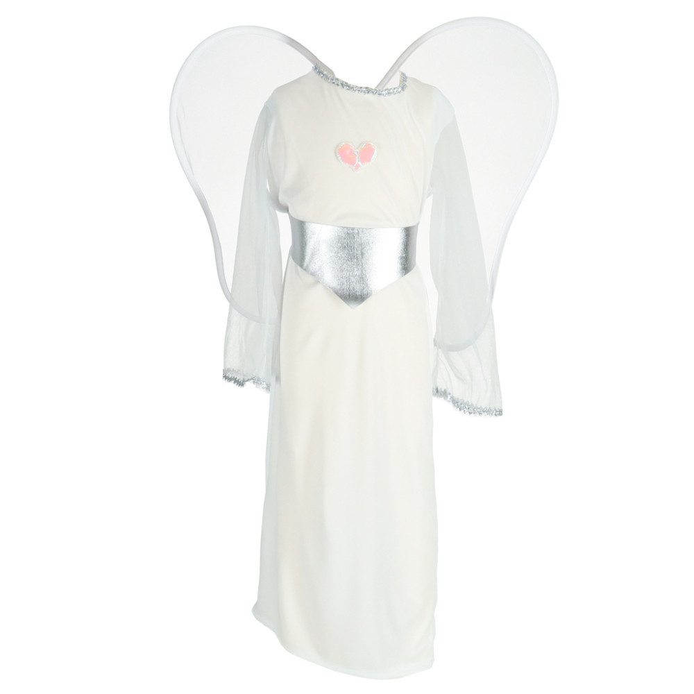 Dětský karnevalový kostým v motivu anděla se svatozáří ve stříbrné barvě. Součástí balení jsou šaty, pásek, křídla a čelenka se svatozáří.