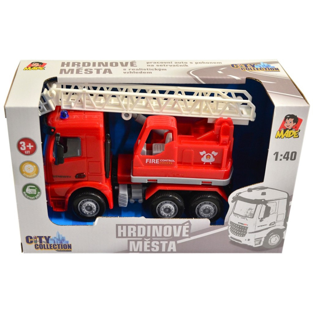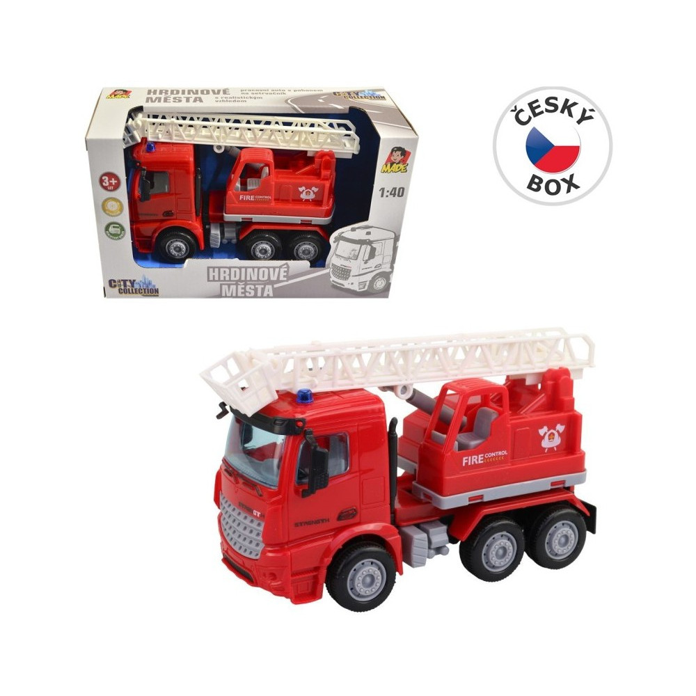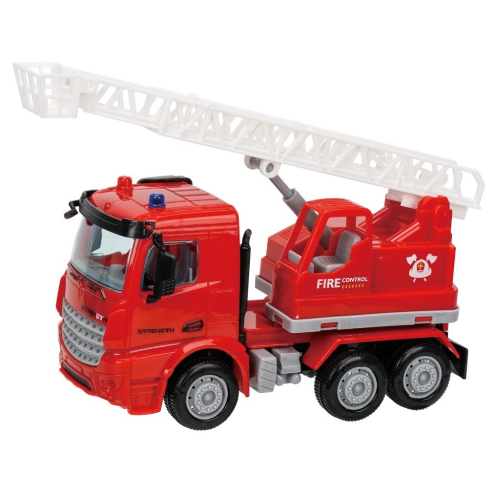 Krásné červené hasičské auto s výsuvným žebříkem s plošinou. Skvělá volba pro kluky, kteří obdivují práci skutečných hasičů. Auto je na setrvačník.
