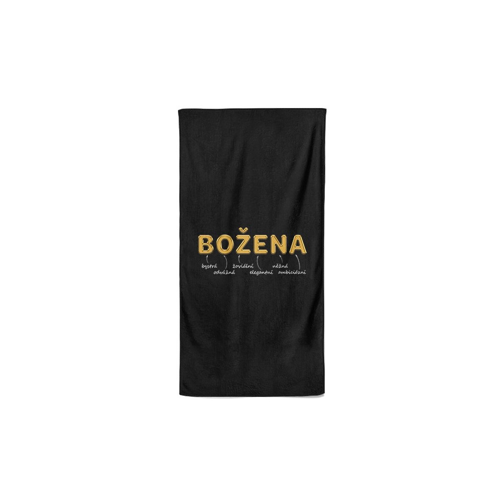 Luxusní osuška v černé barvě s vlastním jménem. Osuška má velký rozměr a materiál je velmi příjemný na dotek a díky speciální technice výroby, kdy se smísí BA a PES vlákna.