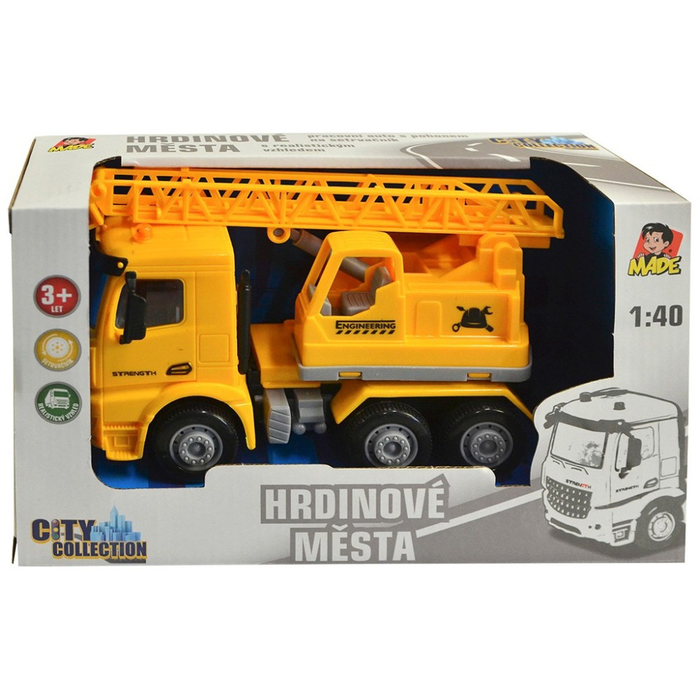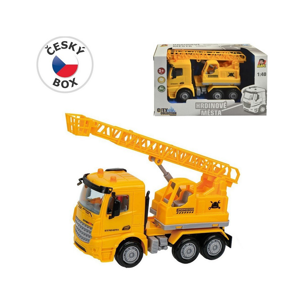 Stavební auto s plošinou na setrvačník. Vhodné do každé sbírky dopravních prostředků. Ideální hračka pro kluky na narozeniny.