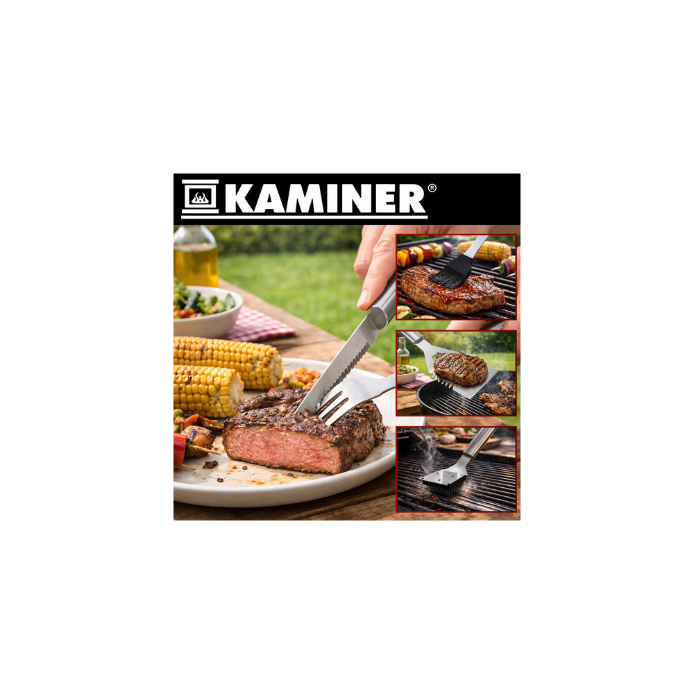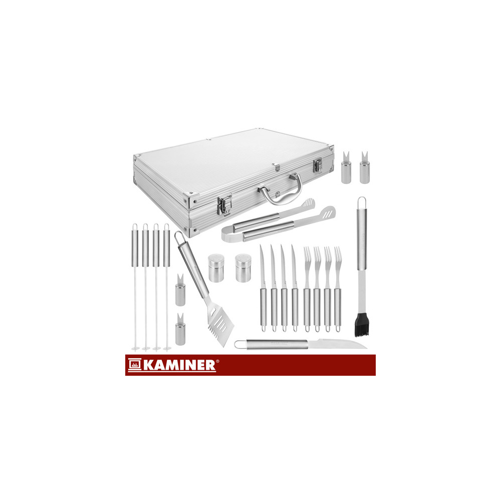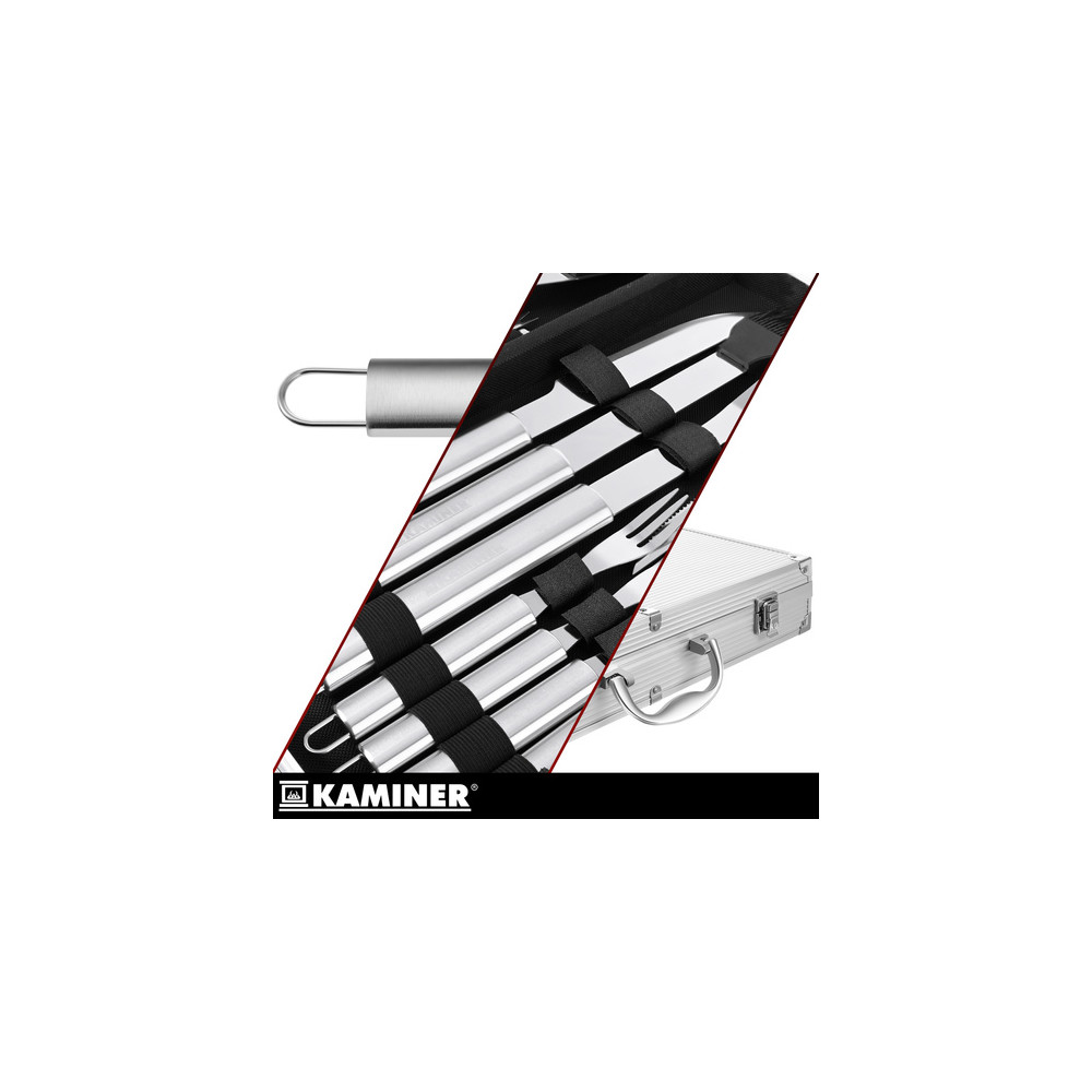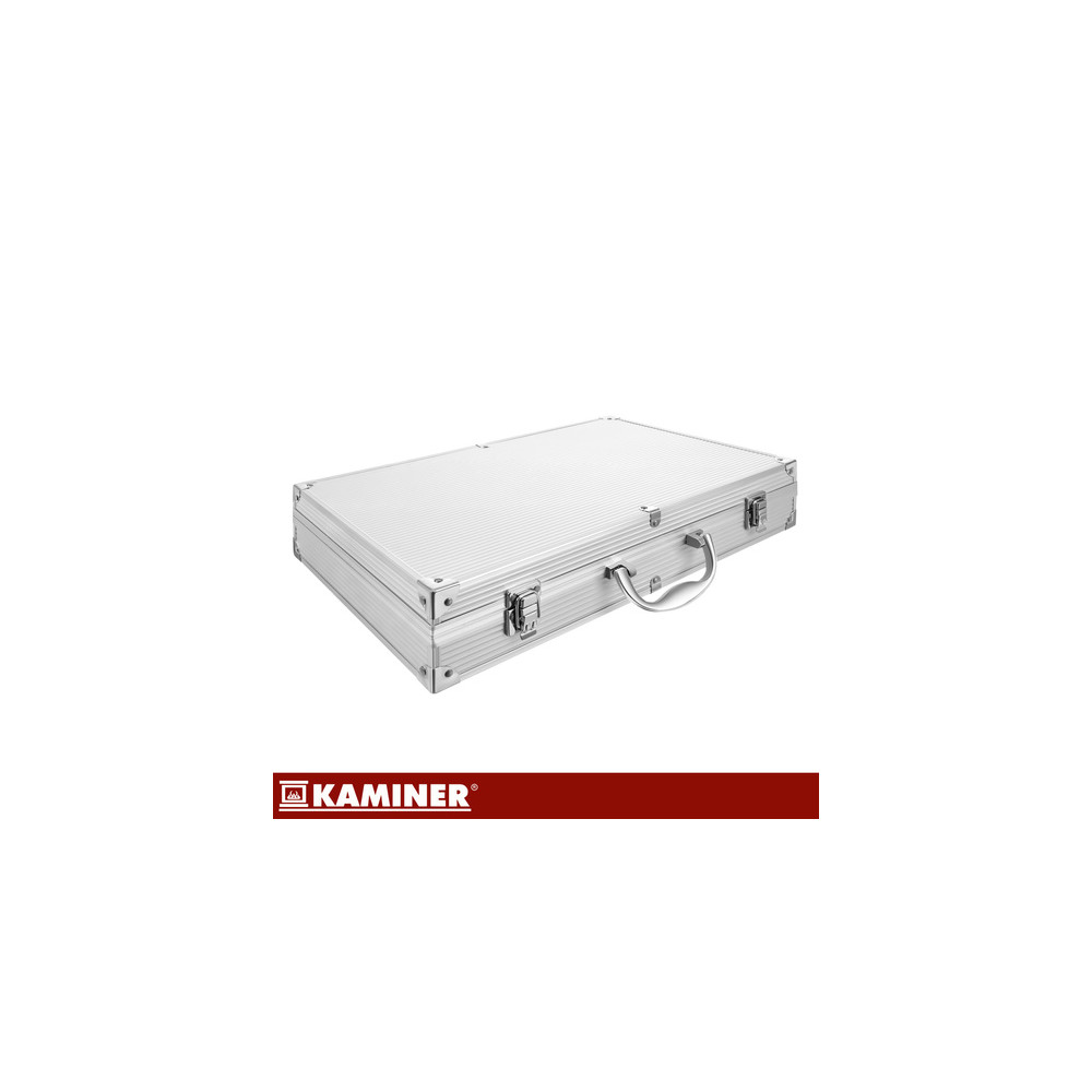 Kompletní sada grilovacího náčiní v praktickém hliníkovém kufříku. Snadno ho převezete na chatu nebo dovolenou. Každý prvek má v kufříku své vyhrazené místo, což zajišťuje přehlednost a praktičnost při výběru správného náčiní.