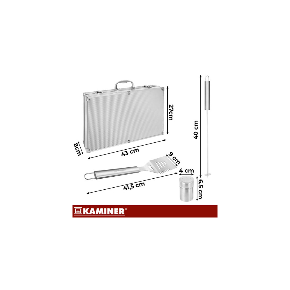 Rozměr: steakové nože 24 x 1,6 cm, vidličky 23 x 1,7 cm, držáky na kukuřici 6,5 x 1,2 cm, špachtle 40,5 x 9 cm, velký nůž 41 x 3 cm, kleště 41 x 5 cm, grilovací vidlička 41,5 x 2,6 cm, kufřík 43 x 27 x 8 cm