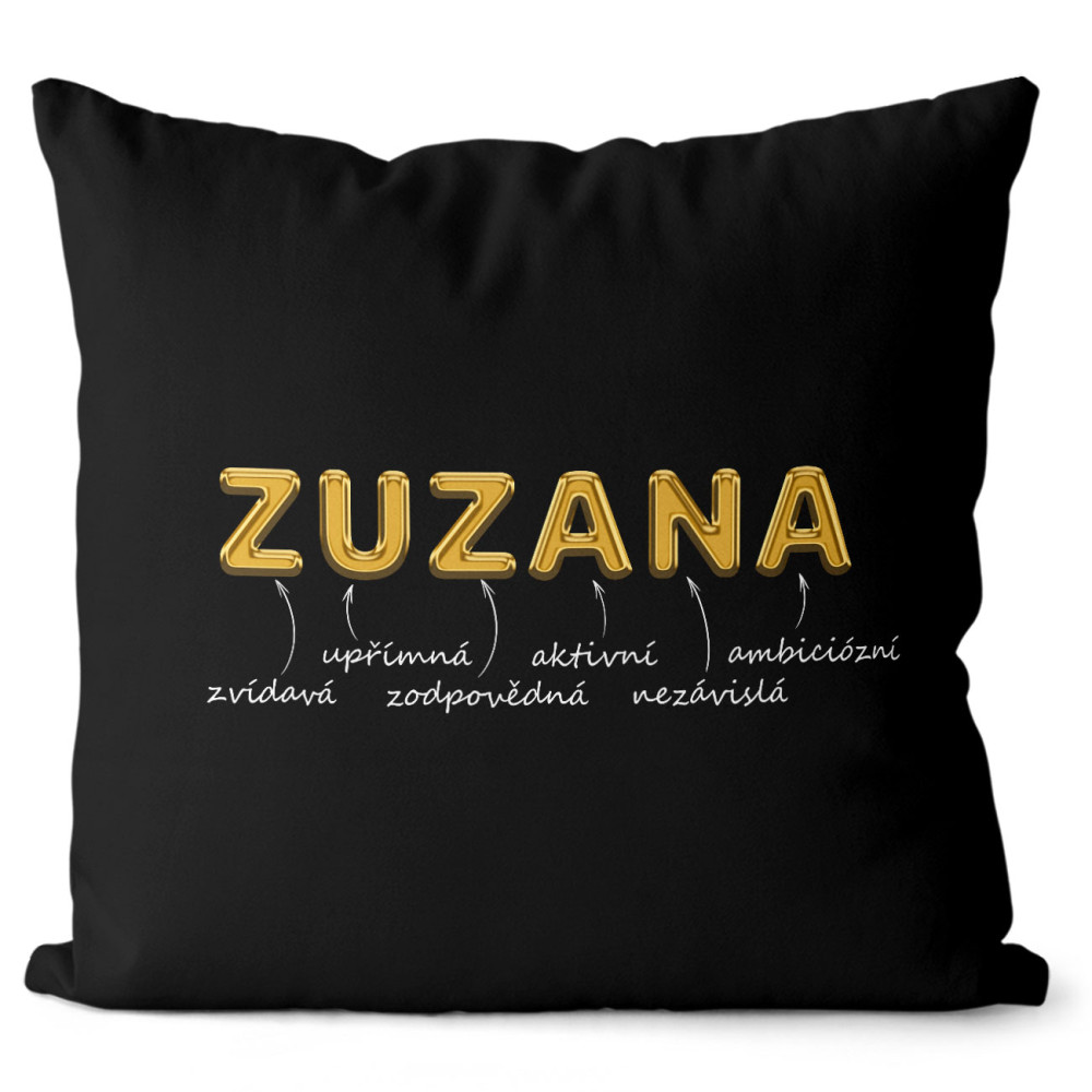 Originální polštářek v černé barvě s vlastním jménem. Má oboustranný potisk se zapínáním a vyjímatelnou výplň.