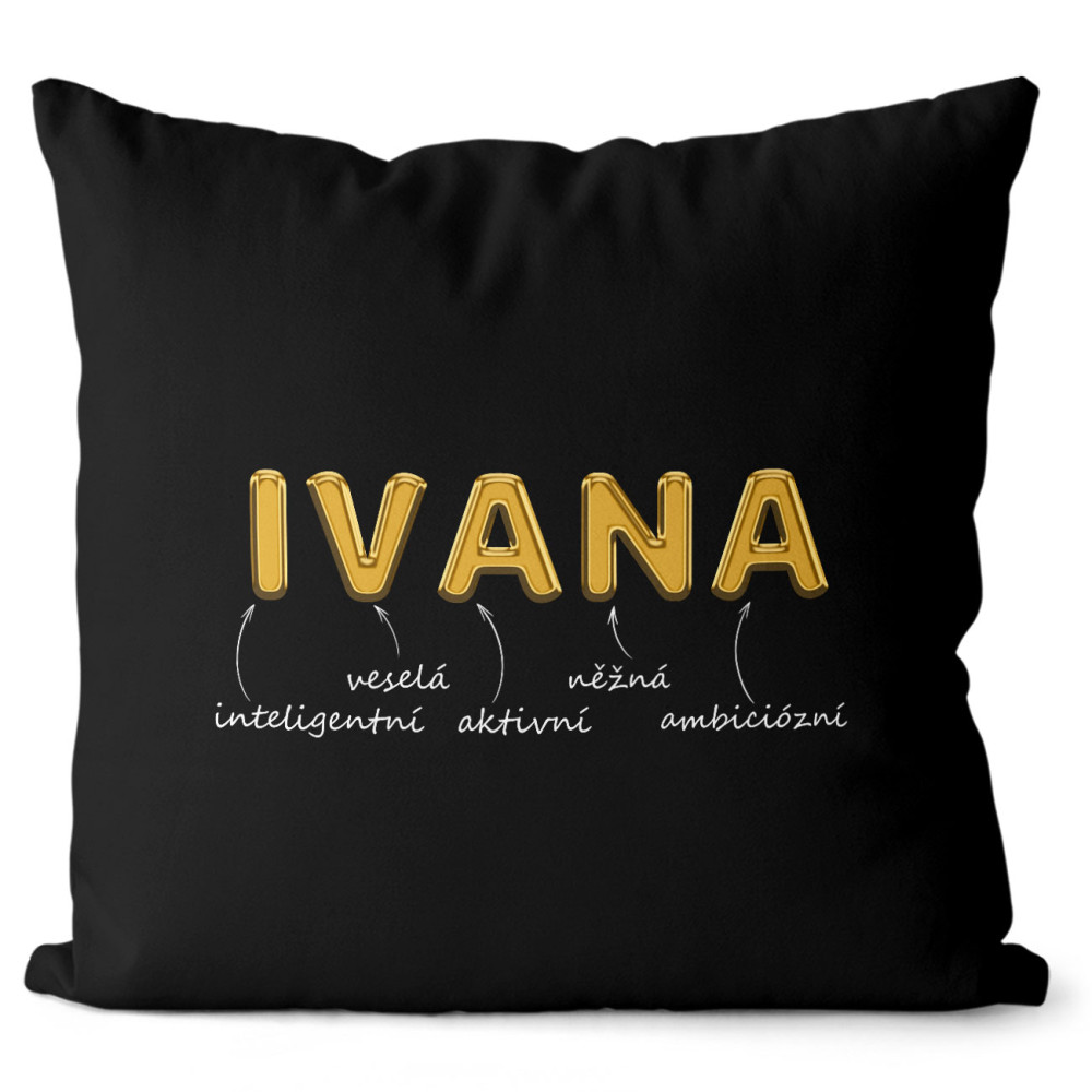 Originální polštářek v černé barvě s vlastním jménem. Má oboustranný potisk se zapínáním a vyjímatelnou výplň.