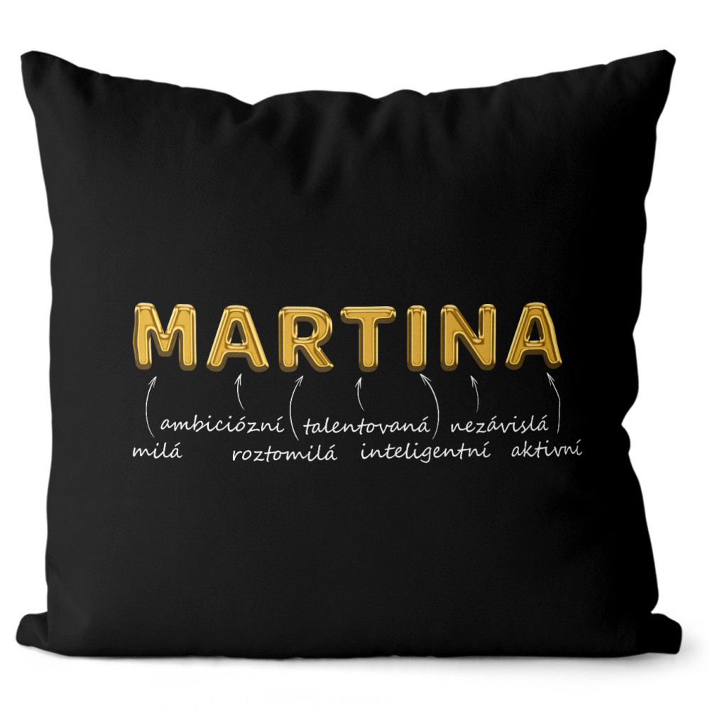 Originální polštářek v černé barvě s vlastním jménem. Má oboustranný potisk se zapínáním a vyjímatelnou výplň.