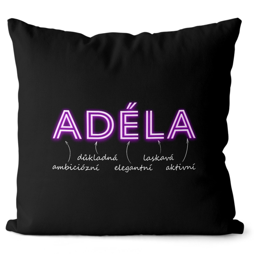 Originální polštářek v černé barvě s vlastním jménem. Má oboustranný potisk se zapínáním a vyjímatelnou výplň.