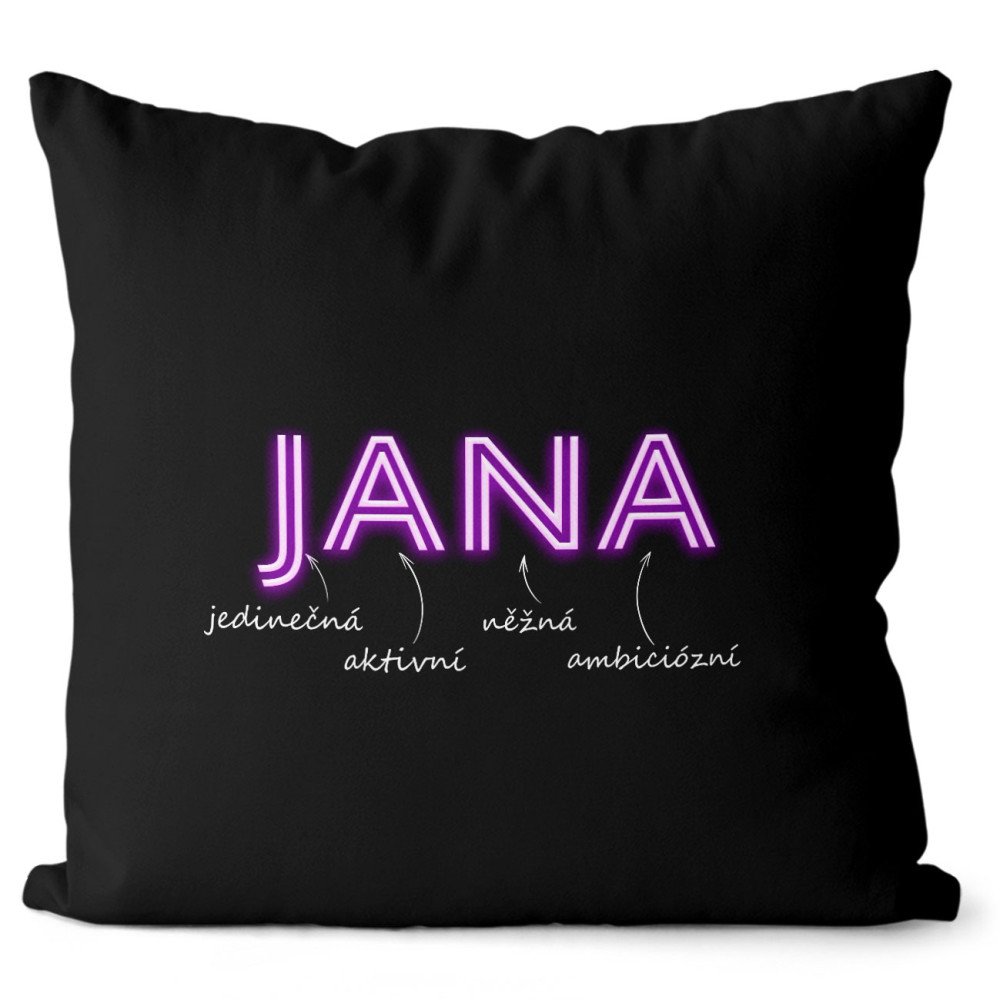 Originální polštářek v černé barvě s vlastním jménem. Má oboustranný potisk se zapínáním a vyjímatelnou výplň.