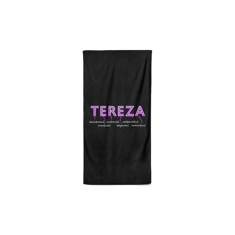 Luxusní osuška v černé barvě s vlastním jménem. Osuška má velký rozměr a materiál je velmi příjemný na dotek a díky speciální technice výroby, kdy se smísí BA a PES vlákna.