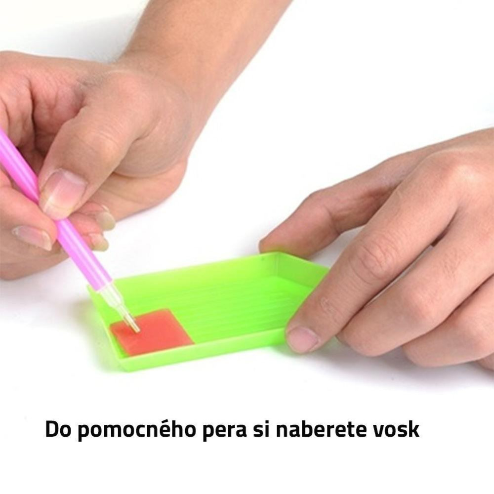 Postup: Obrázek je zakrytý ochrannou folii, kterou sundávejte vždy postupně, tak jak budete aplikovat kamínky. Při sundání celé folie najednou hrozí, že se ztratí viskozita lepidla a kamínky nebudou držet. Plátno obsahuje označení, která jsou umístěna i na sáčcích s kamínky. Podle označení, víte kam který kamínek patří. Nejprve si do hrotu tužky naberete vosk, díky kterému se kamínky snadno přichytí na pero. Kamínky perem aplikujete na obrázek.