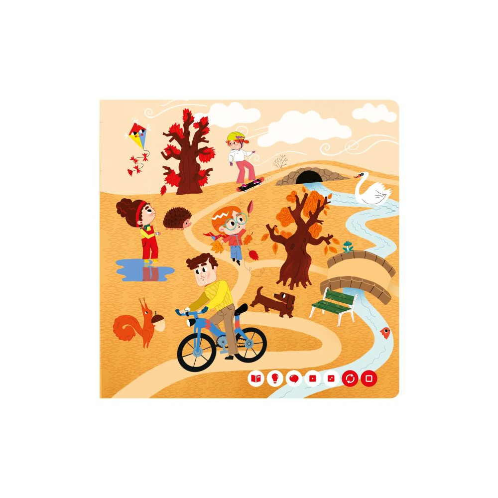 Děti se v každém prostředí seznámí s 10 slovesy a několika základními slovíčky. Každé slovo uslyší také ve větě a své znalosti si ověří pomocí kvízů. Součástí knihy jsou veselé písničky a melodie.