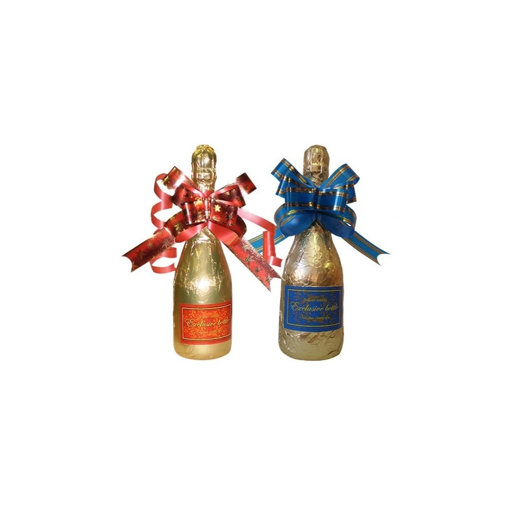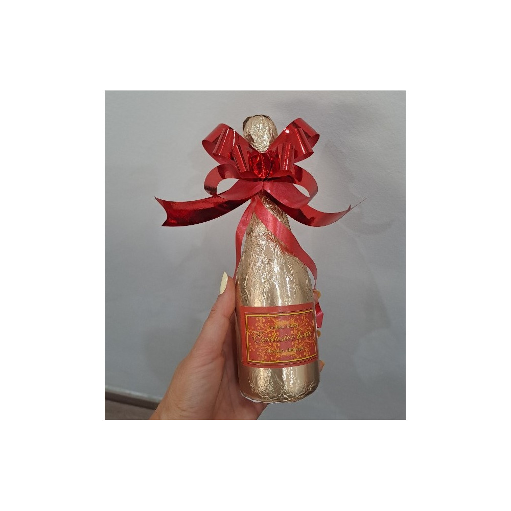 Mléčná belgická čokoláda vyrobena do tvaru láhve šampaňského. Balena je ve zlatém alobale s dárkovou mašlí.